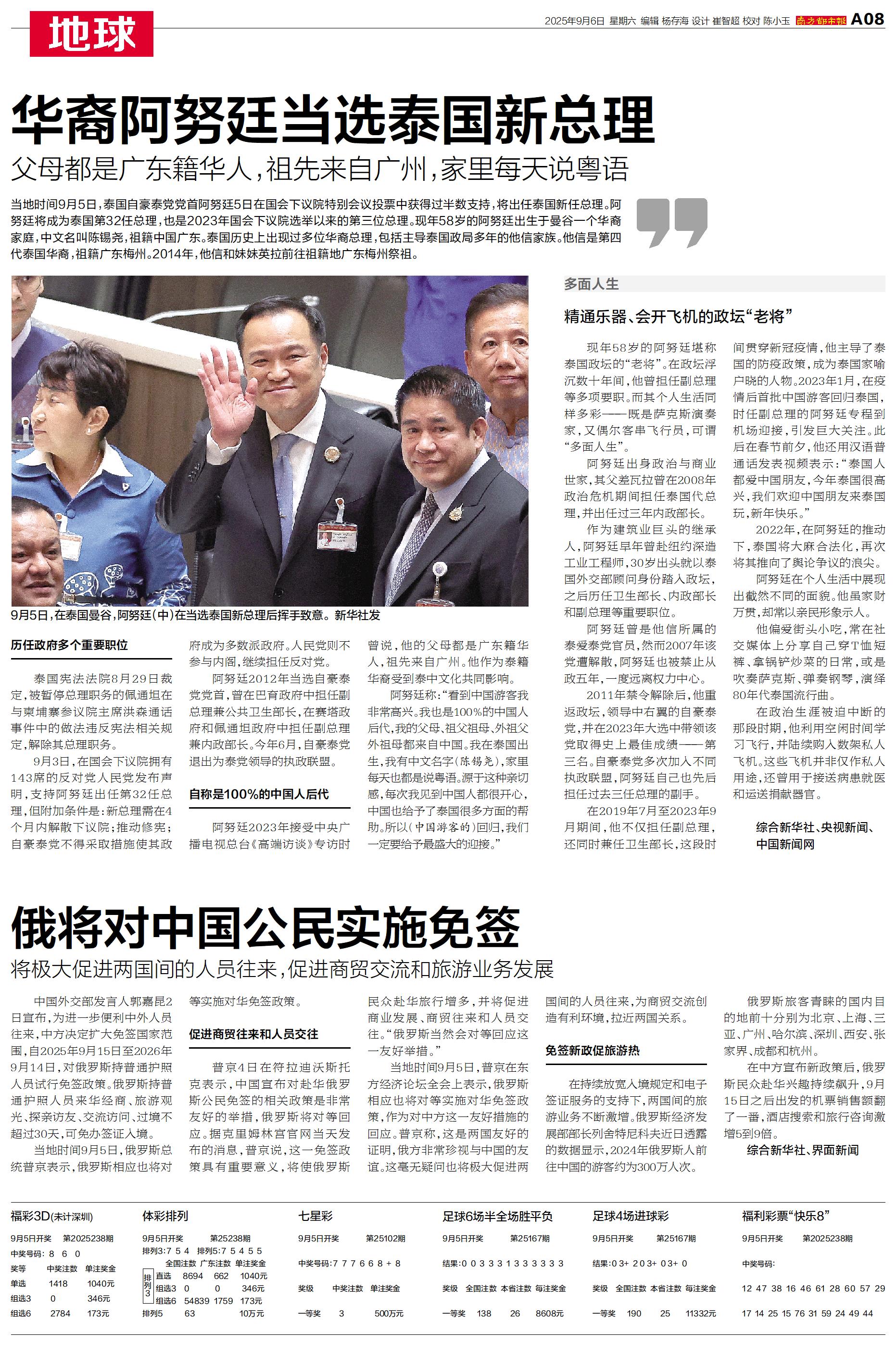 当地时间9月5日,泰国自豪泰党党首阿努廷5日在国会下议院特别会议投票中获得过半数支持,将出任泰国新任总理。阿努廷将成为泰国第32任总理,也是2023年国会下议院选举以来的第三位总理。现年58岁的阿