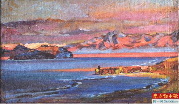 相比前两位画家,司徒乔展出的水彩、色粉彩铅和油画却是热烈的。如油画《夕阳》描绘了夕阳下的新疆赛里木湖,广阔浩大,展现了新疆当时的风土样貌。