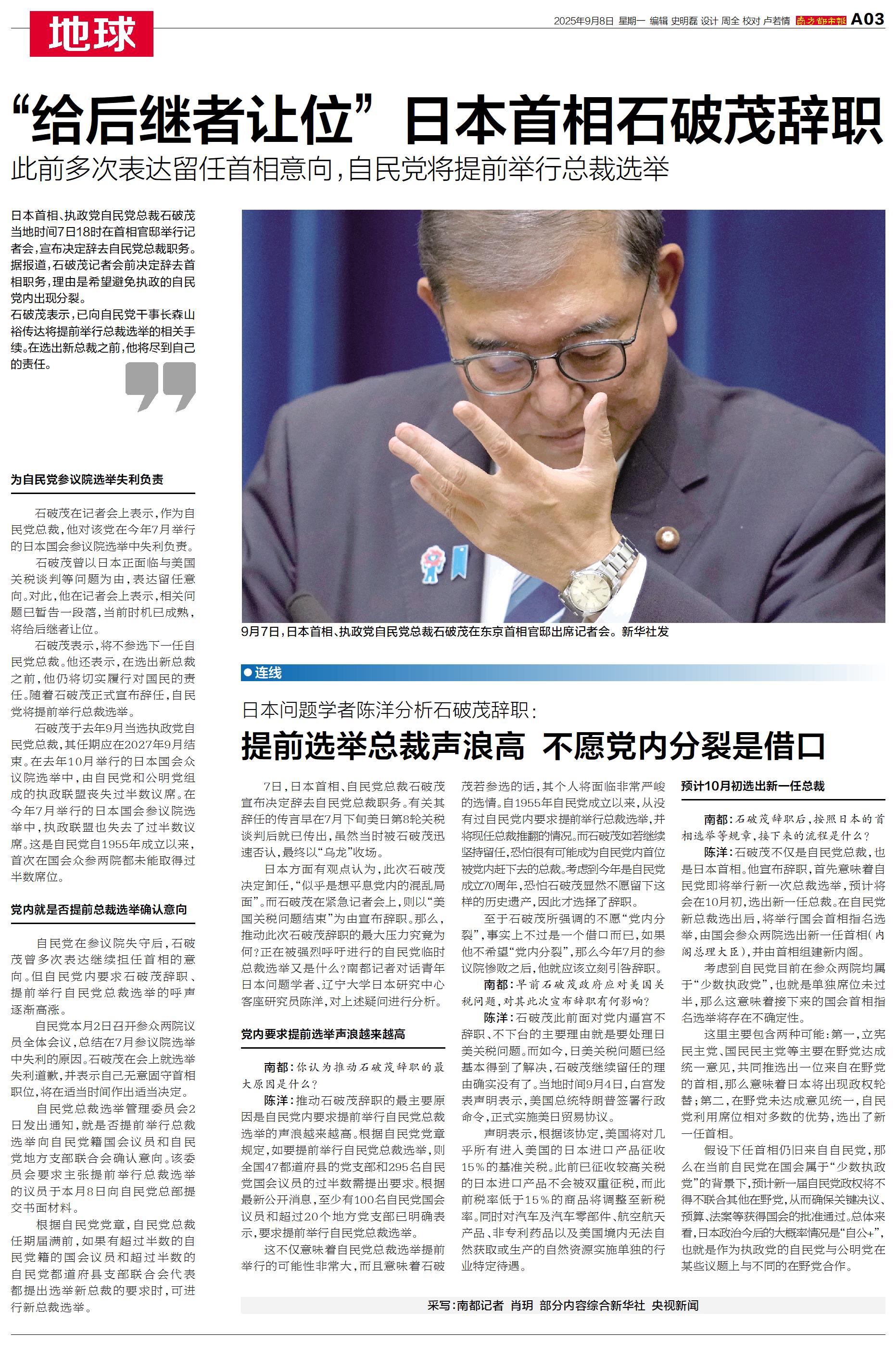 日本首相、执政党自民党总裁石破茂当地时间7日18时在首相官邸举行记者会,宣布决定辞去自民党总裁职务。