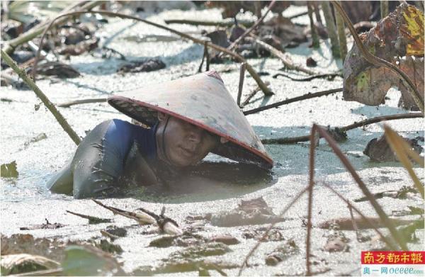 ⒉采藕人侧身俯首,探入淤泥深处,用水枪寻找藕的位置。