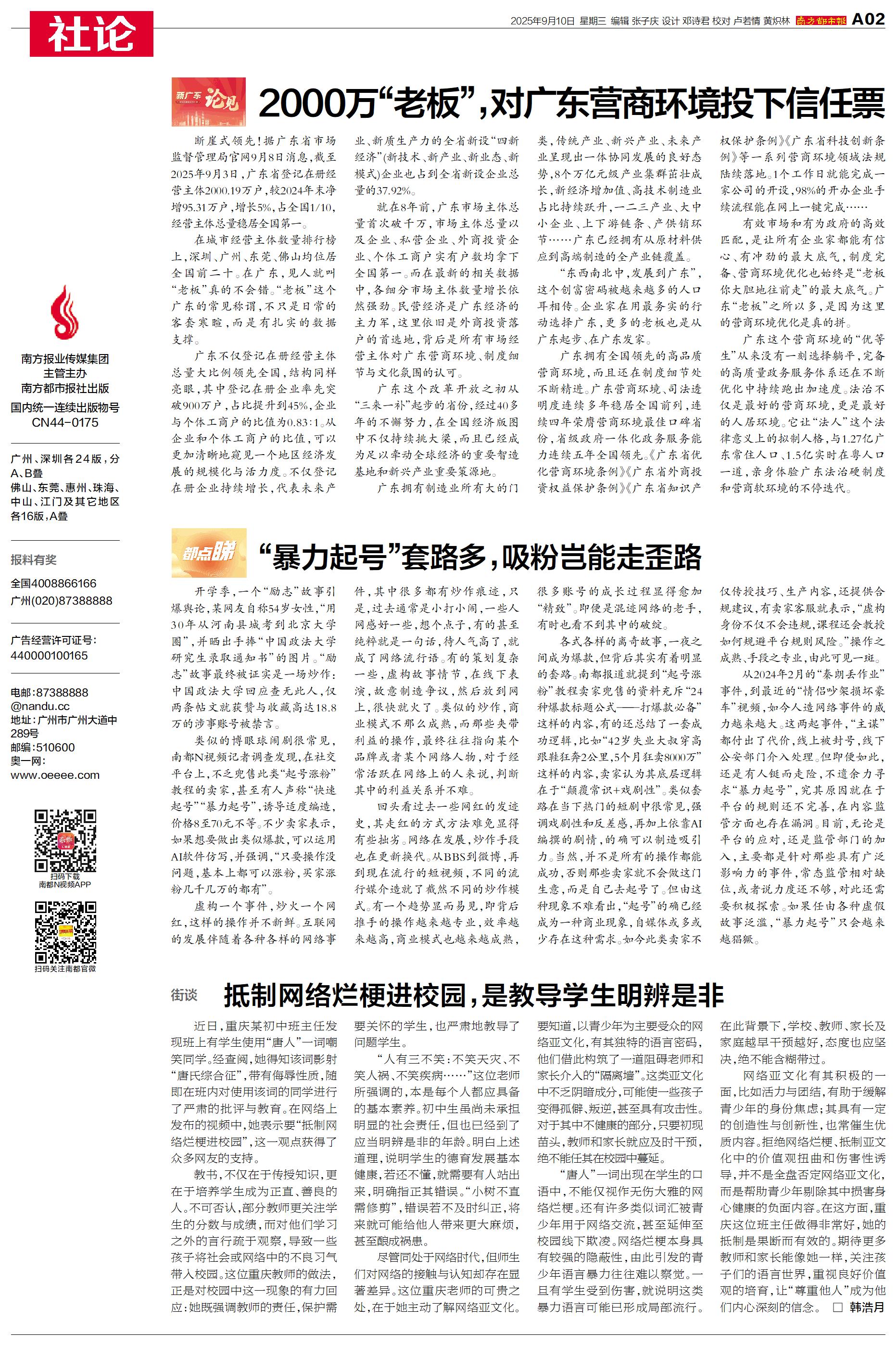 据广东省市场监督管理局官网9月8日消息,截至2025年9月3日,广东省登记在册经营主体2000.19万户,较2024年末净增95.31万户,增长5%,占全国1/10,经营主体总量稳居全国第一。