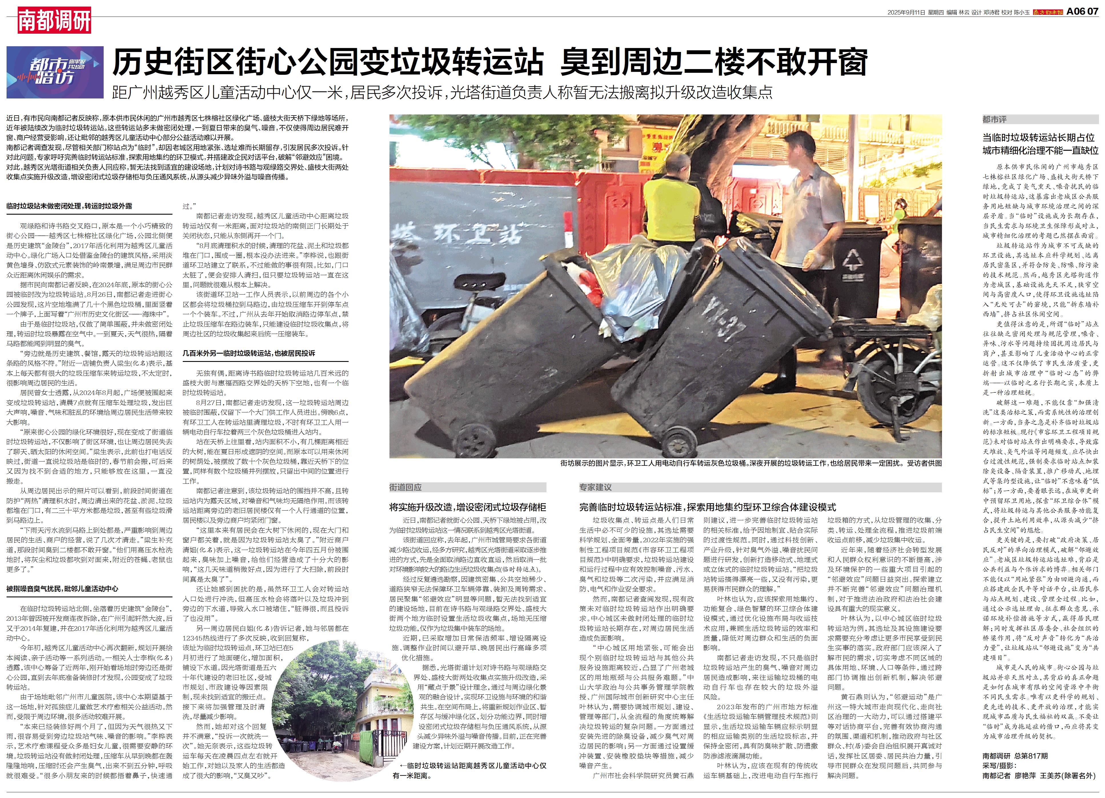 近日,有市民向南都记者反映称,原本供市民休闲的广州市越秀区七株榕社区绿化广场、盛枝大街天桥下绿地等场所,近年被陆续改为临时垃圾转运站。