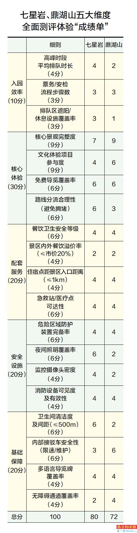 在社交平台上,有游客发布自己体验过后的“避雷帖”,“售票处不知道在哪”、“排队排了一个多小时”、“性价比低”……为回应公众关切,近期南都记者以游客视角,对七星岩和鼎湖山进行了同维度测评。通过现场走访和数据分析,从五大维度对两大景区进行了深度测评,揭示游客体验的真实面貌。本次测评聚焦五大核心痛点:入园效率、核心体验、配套服务、安全设施和基础保障,采用“一把尺子量到底”的打分体系(总分100分)。测评结果显示,七星岩以80分领先,鼎湖山得分为72分。测评不仅亮出“成绩单”,更精准指出短板,为景区优化提供路径,助力肇庆打造“来了还想来”的旅游目的地。