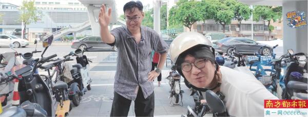 今年8月,在广州海珠区石榴岗路天桥边,聪少(右)借了台电动车,跟超哥(左)做天桥坡度测试。