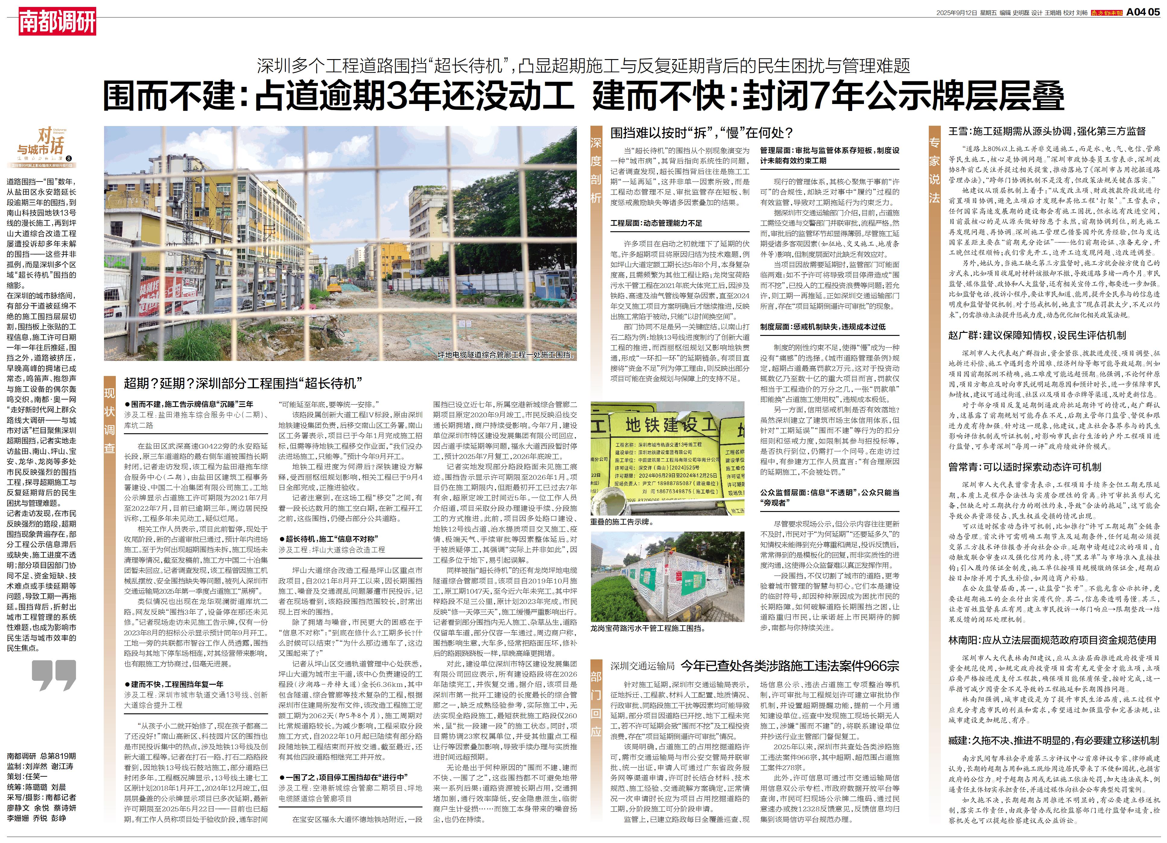 道路围挡一“围”数年,从盐田区永安路延长段逾期三年的围挡,到南山科技园地铁13号线的漫长施工,再到坪山大道综合改造工程屡遭投诉却多年未解的围挡——这些并非孤例,而是深圳多个区域“超长待机”围挡的缩影。