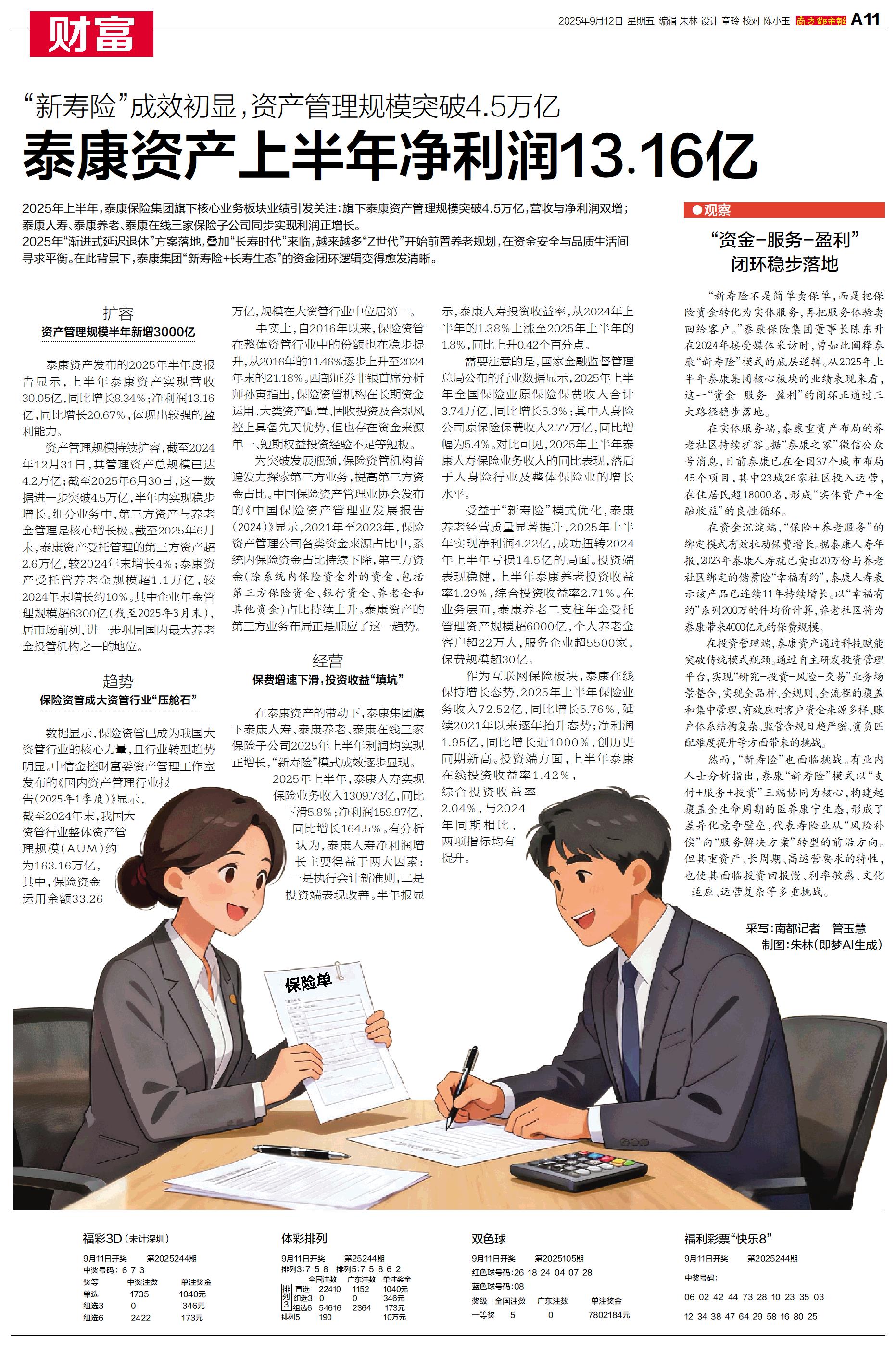 2025年上半年,泰康保险集团旗下核心业务板块业绩引发关注:旗下泰康资产管理规模突破4.5万亿,营收与净利润双增;泰康人寿、泰康养老、泰康在线三家保险子公司同步实现利润正增长。