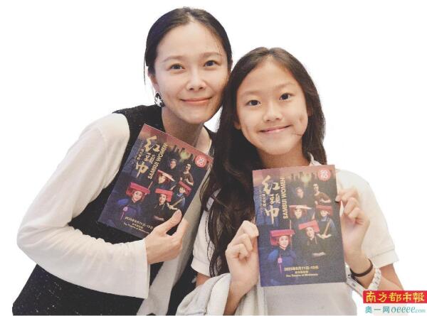 两名新加坡观众手持粤剧《红头巾》的戏桥合影。 广东粤剧院 杨佳 摄