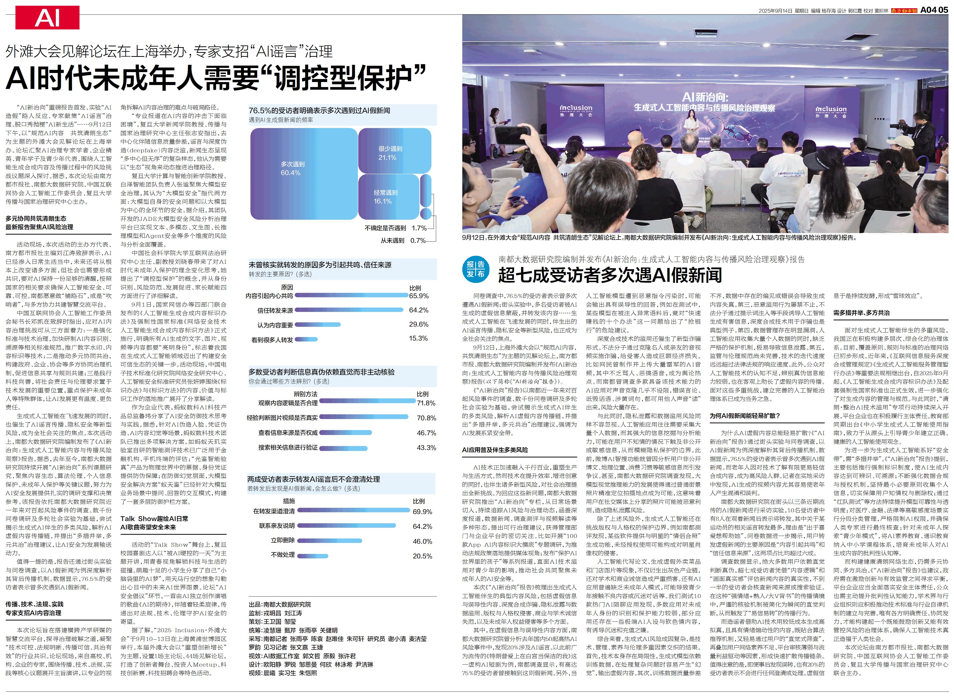 问卷调查中,76.5%的受访者表示曾多次遭遇AI假新闻;街头实验中,多名受访者被AI生成的虚假信息蒙蔽,并转发该内容……生成式人工智能在飞速发展的同时,伴生出的AI谣言传播、隐私安全等新型风险,也正成为全社会关注的焦点。