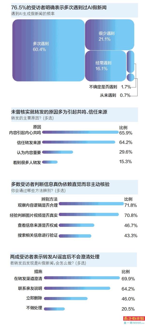 值得一提的是,报告还通过街头实验与问卷调查,以AI假新闻为例深度解析其背后传播机制。数据显示,76.5%的受访者表示曾多次遇到AI假新闻。