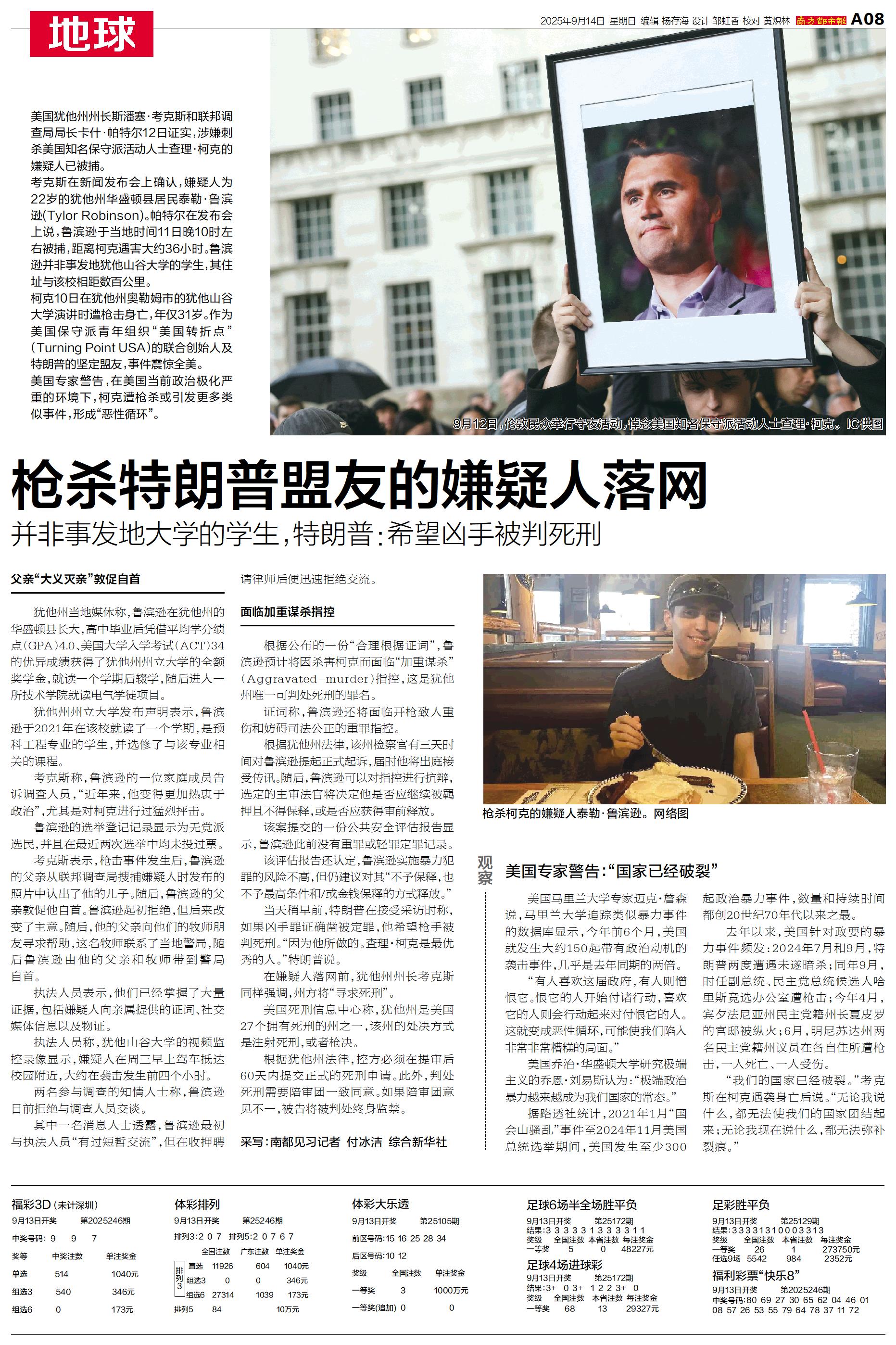 美国犹他州州长斯潘塞·考克斯和联邦调查局局长卡什·帕特尔12日证实,涉嫌刺杀美国知名保守派活动人士查理·柯克的嫌疑人已被捕。