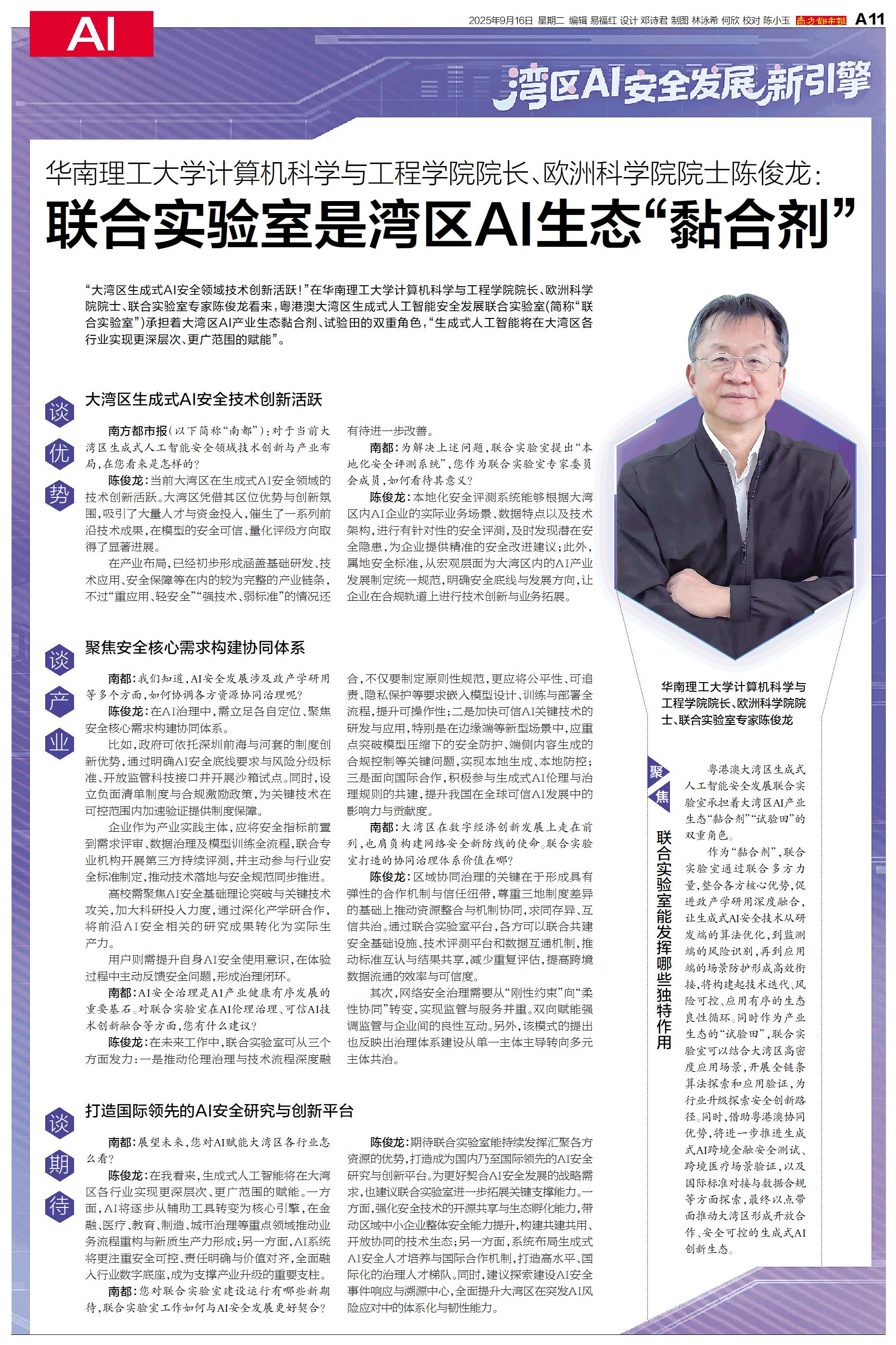 联合实验室专家陈俊龙看来,粤港澳大湾区生成式人工智能安全发展联合实验室承担着大湾区AI产业生态黏合剂、试验田的双重角色。