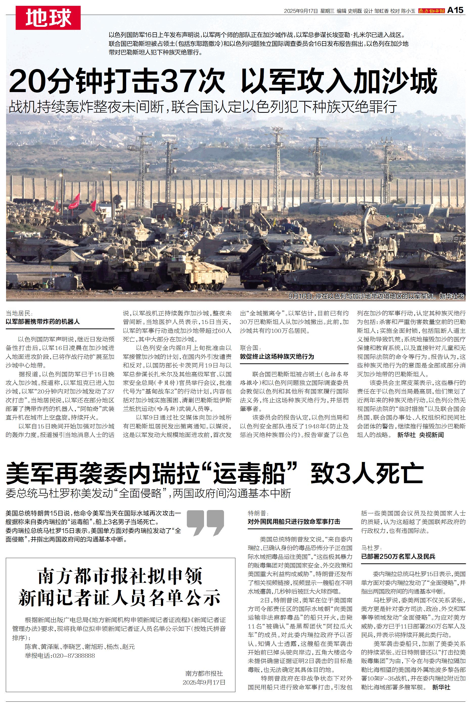 据报道,以色列国防军已于15日晚攻入加沙城。报道称,以军坦克已进入加沙城,以军“20分钟内对加沙城发动了37次打击”。当地居民说,以军还在部分地区部署了携带炸药的机器人,“阿帕奇”武装直升机在城市上空盘旋,持续开火。