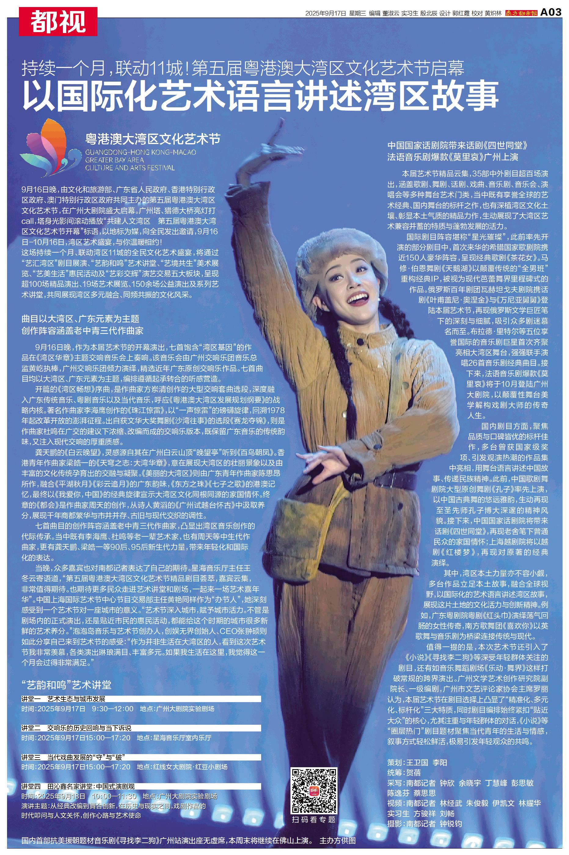 9月16日晚,由文化和旅游部、广东省人民政府、香港特别行政区政府、澳门特别行政区政府共同主办的第五届粤港澳大湾区文化艺术节,在广州大剧院盛大启幕。