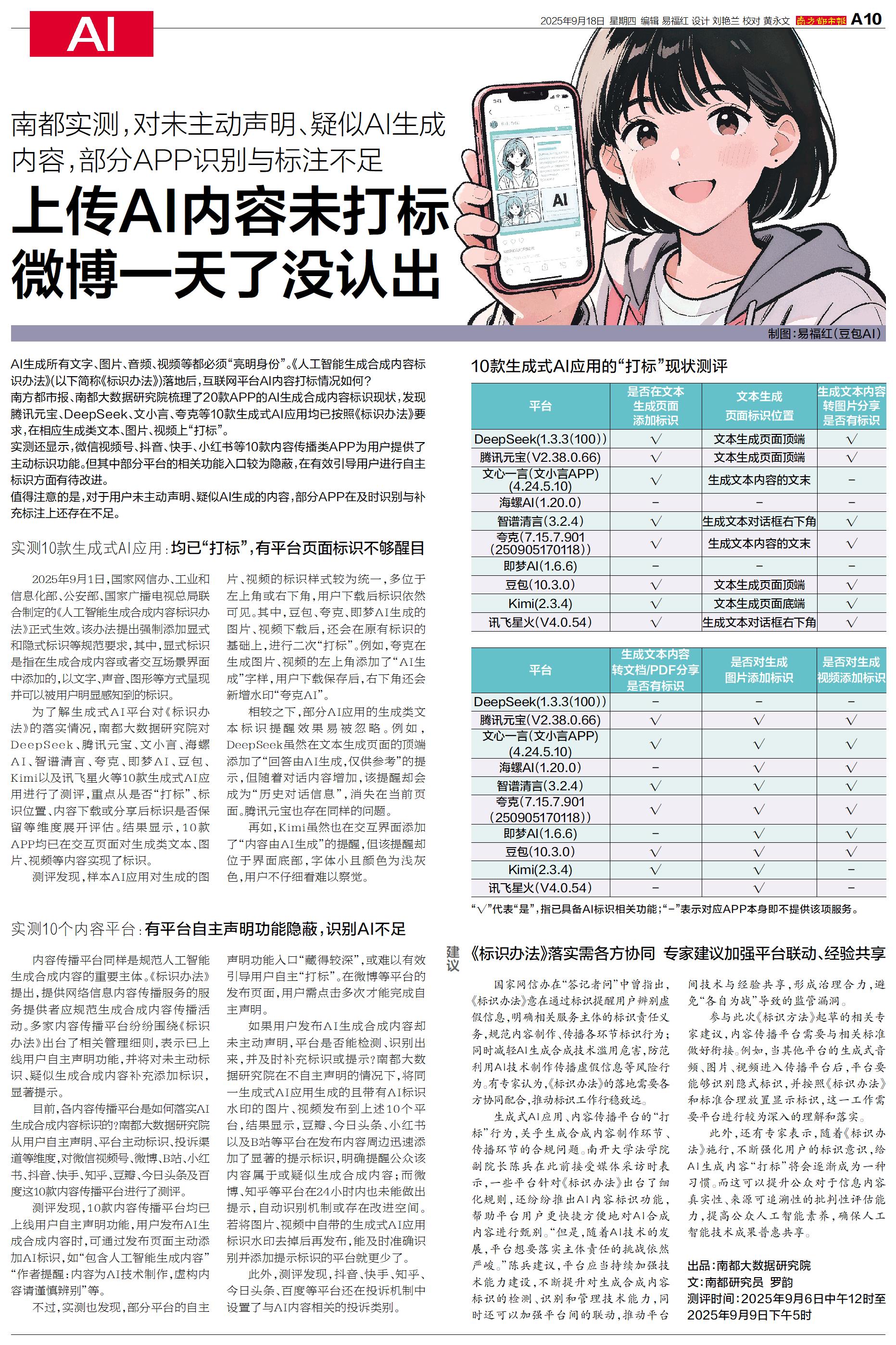 为了解生成式AI平台对《标识办法》的落实情况,南都大数据研究院对DeepSeek、腾讯元宝、文小言、海螺AI、智谱清言、夸克、即梦AI、豆包、Kimi以及讯飞星火等10款生成式AI应用进行了测评,重点从是否“打标”、标识位置、内容下载或分享后标识是否保留等维度展开评估。结果显示,10款APP均已在交互页面对生成类文本、图片、视频等内容实现了标识。