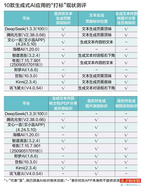南方都市报、南都大数据研究院梳理了20款APP的AI生成合成内容标识现状,发现腾讯元宝、DeepSeek、文小言、夸克等10款生成式AI应用均已按照《标识办法》要求,在相应生成类文本、图片、视频上“打标”。