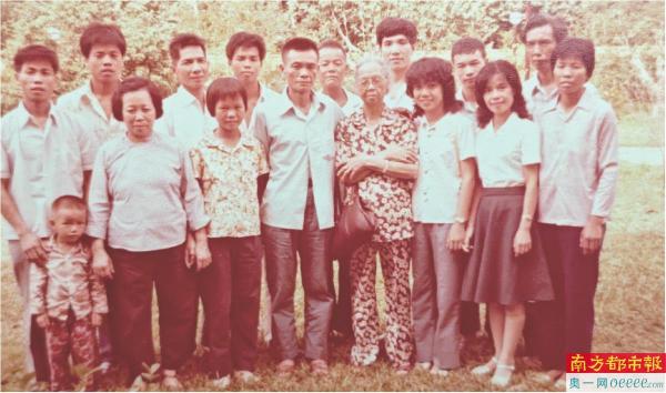 郑社心在新加坡家中给南都记者找出母亲钟彩合(前排右四)、弟弟郑社义(前排右五)等家人的合影,这张照片拍摄于上世纪80年代。 受访者供图