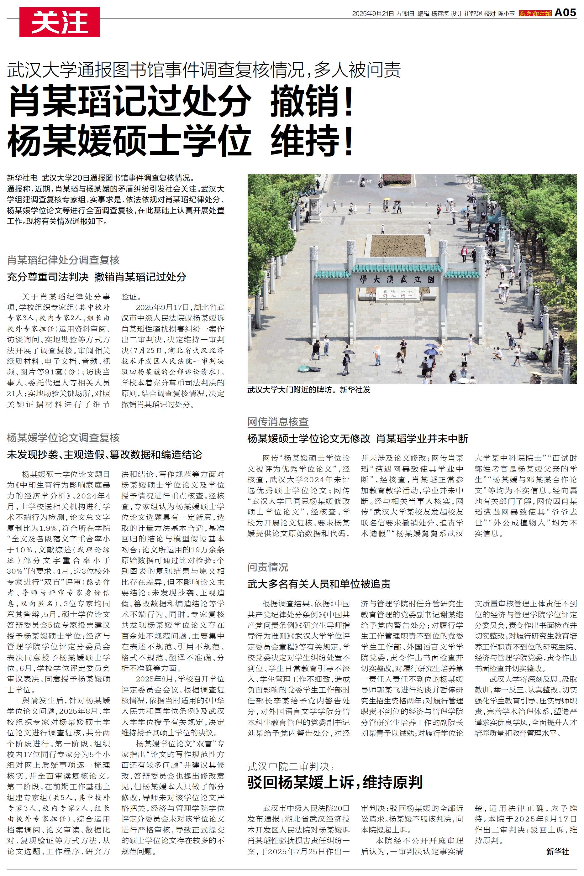 2025年9月17日,湖北省武汉市中级人民法院就杨某媛诉肖某瑫性骚扰损害纠纷一案作出二审判决,决定维持一审判决(7月25日,湖北省武汉经济技术开发区人民法院一审判决驳回杨某媛的全部诉讼请求)。学校本着充分尊重司法判决的原则,结合调查复核情况,决定撤销肖某瑫记过处分。