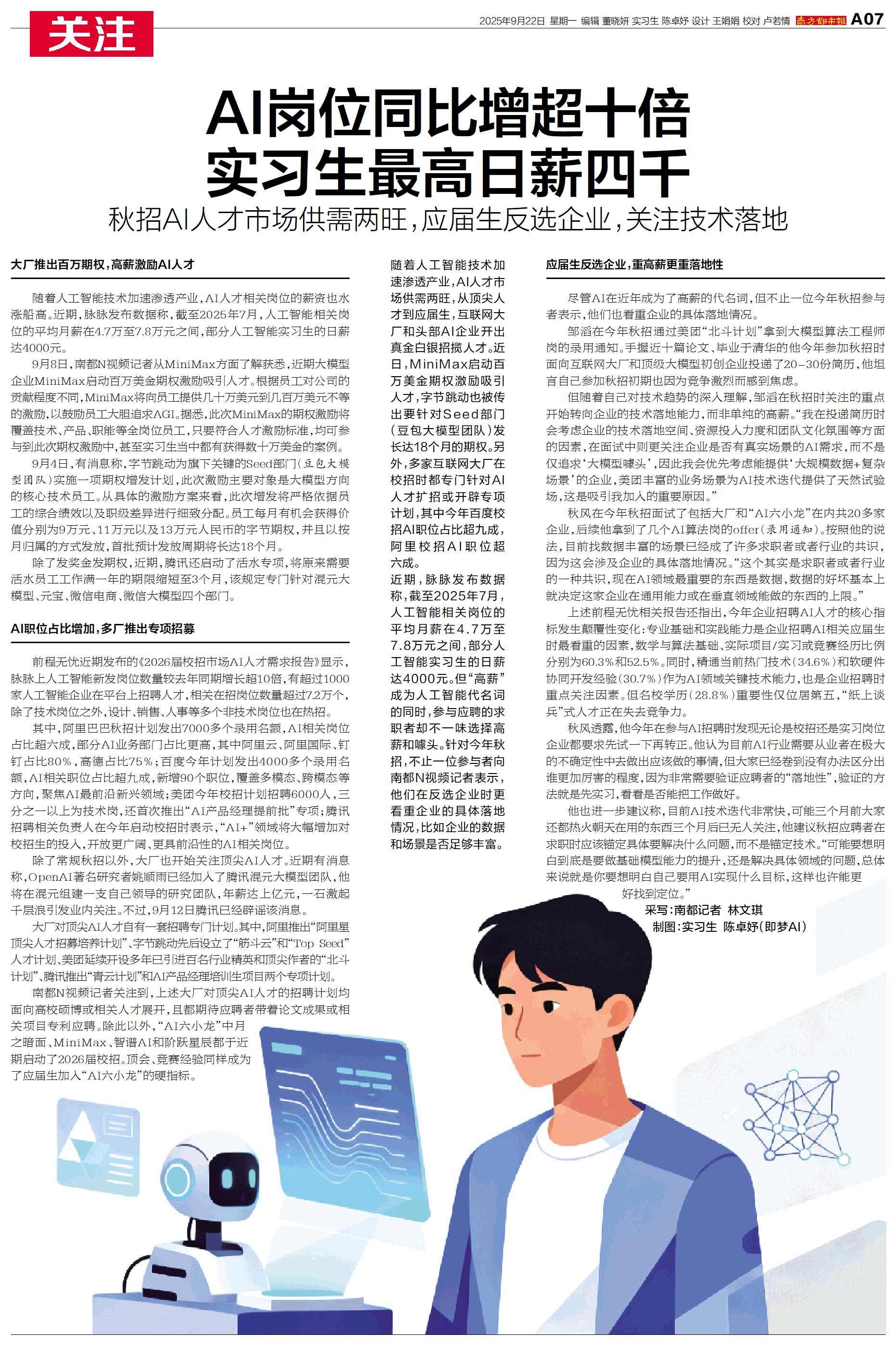 近期,脉脉发布数据称,截至2025年7月,人工智能相关岗位的平均月薪在4.7万至7.8万元之间,部分人工智能实习生的日薪达4000元。但“高薪”成为人工智能代名词的同时,参与应聘的求职者却不一味选择高薪和噱头。针对今年秋招,不止一位参与者向南都N视频记者表示,他们在反选企业时更看重企业的具体落地情况,比如企业的数据和场景是否足够丰富。