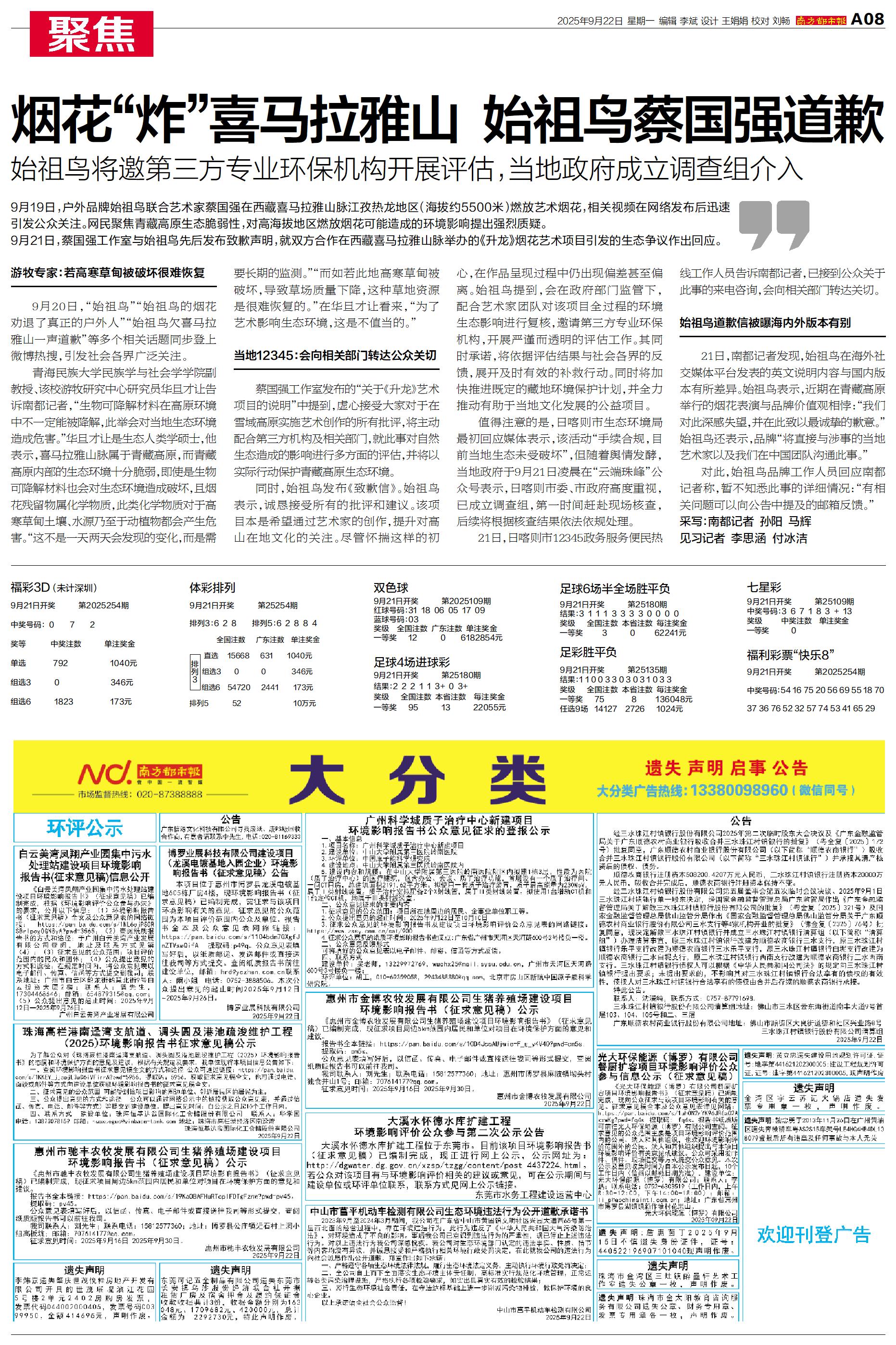 9月19日,户外品牌始祖鸟联合艺术家蔡国强在西藏喜马拉雅山脉江孜热龙地区(海拔约5500米)燃放艺术烟花,相关视频在网络发布后迅速引发公众关注。