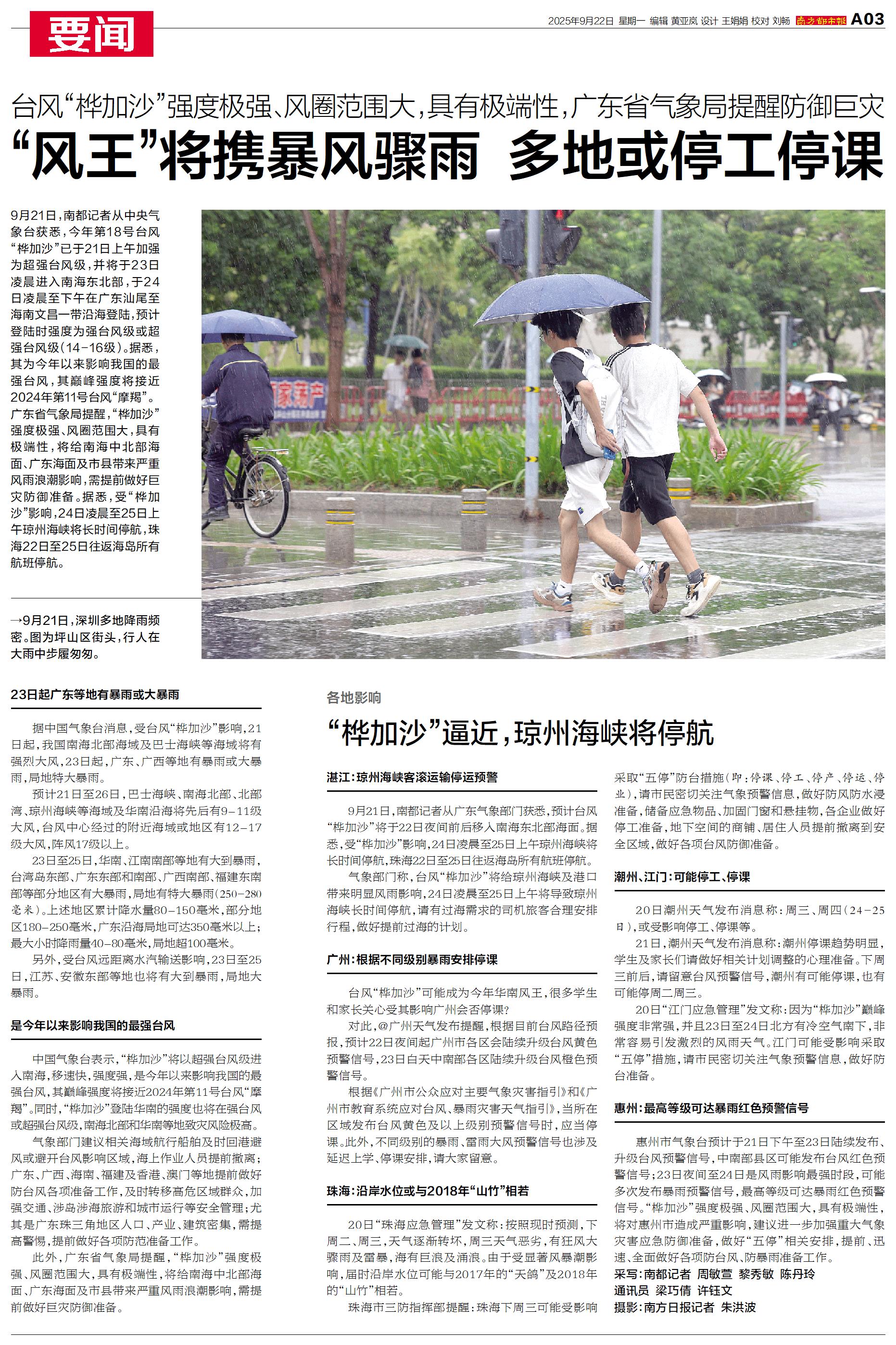广东省气象局提醒,“桦加沙”强度极强、风圈范围大,具有极端性,将给南海中北部海面、广东海面及市县带来严重风雨浪潮影响,需提前做好巨灾防御准备。