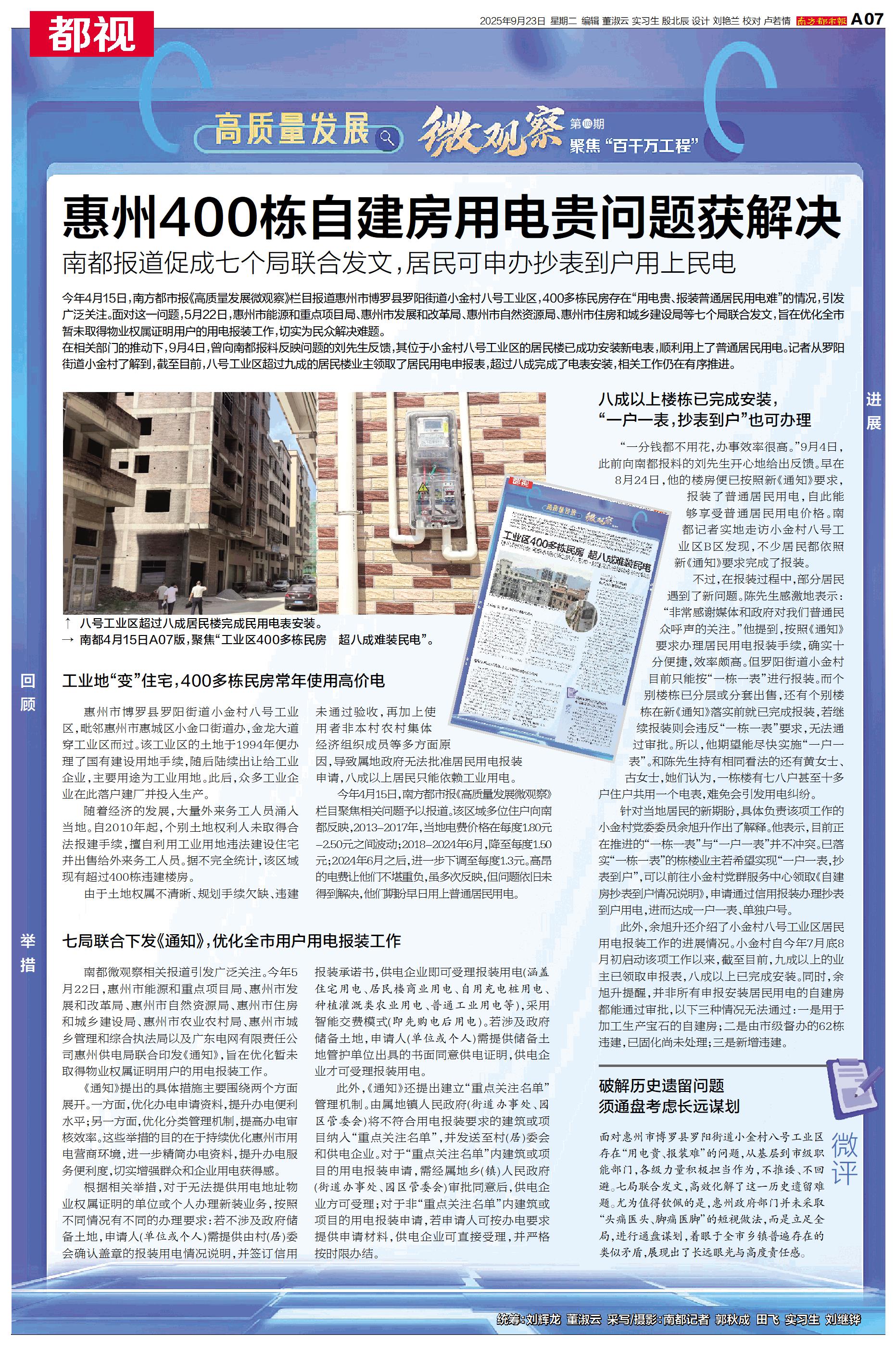 今年4月15日,南方都市报《高质量发展微观察》栏目报道惠州市博罗县罗阳街道小金村八号工业区,400多栋民房存在“用电贵、报装普通居民用电难”的情况,引发广泛关注。