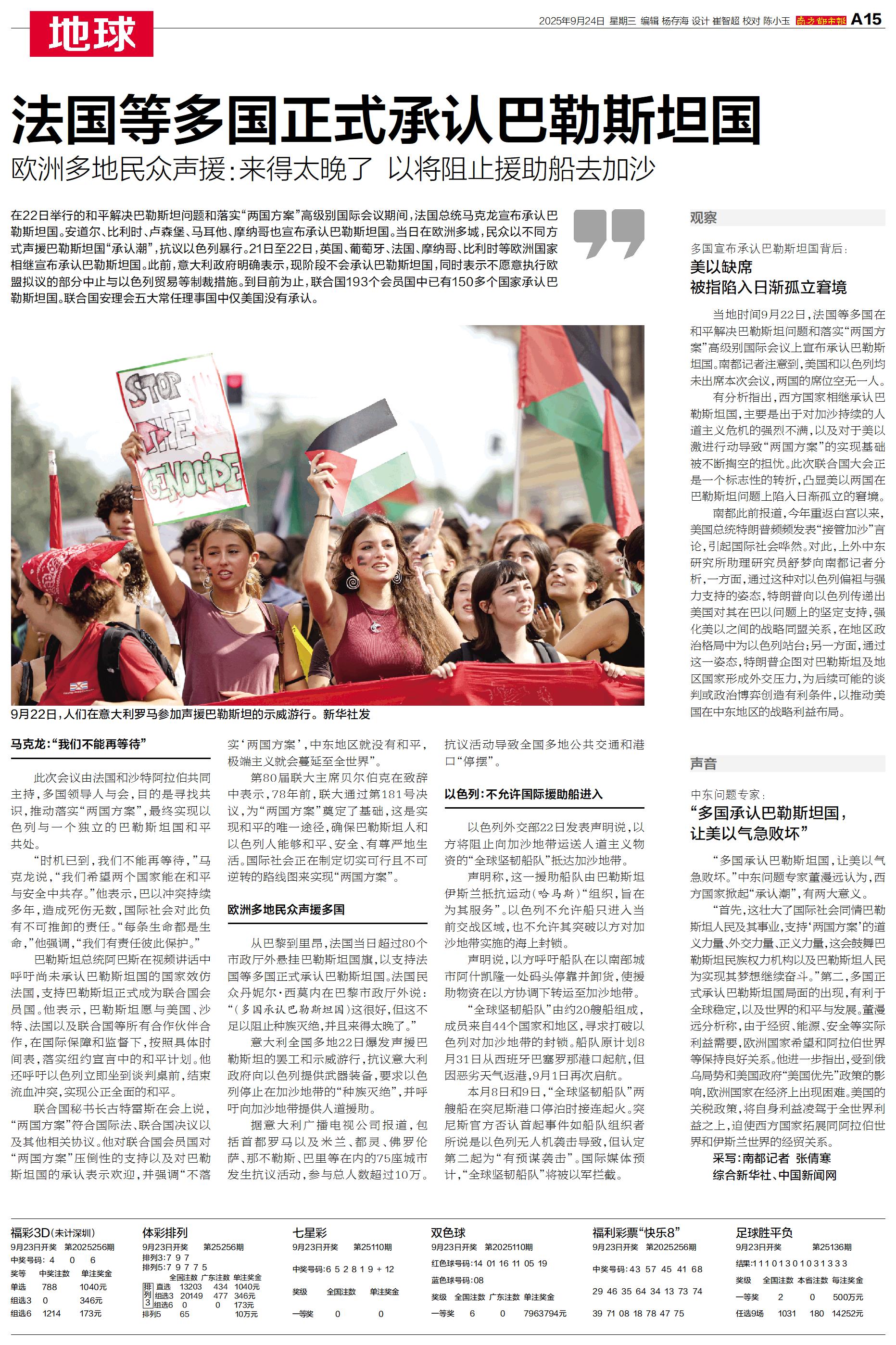 在22日举行的和平解决巴勒斯坦问题和落实“两国方案”高级别国际会议期间,法国总统马克龙宣布承认巴勒斯坦国。