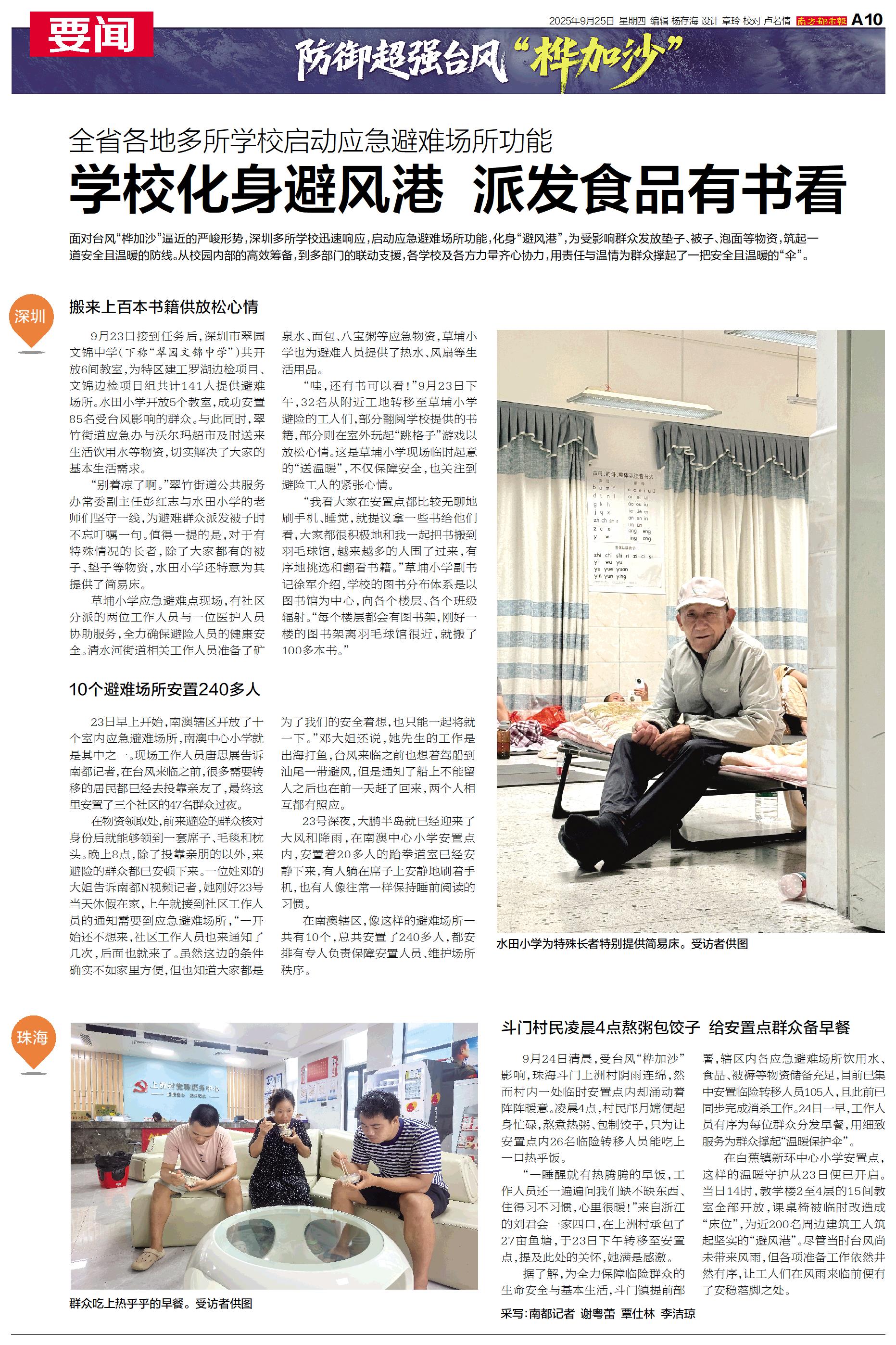 面对台风“桦加沙”逼近的严峻形势,深圳多所学校迅速响应,启动应急避难场所功能,化身“避风港”,为受影响群众发放垫子、被子、泡面等物资,筑起一道安全且温暖的防线。
