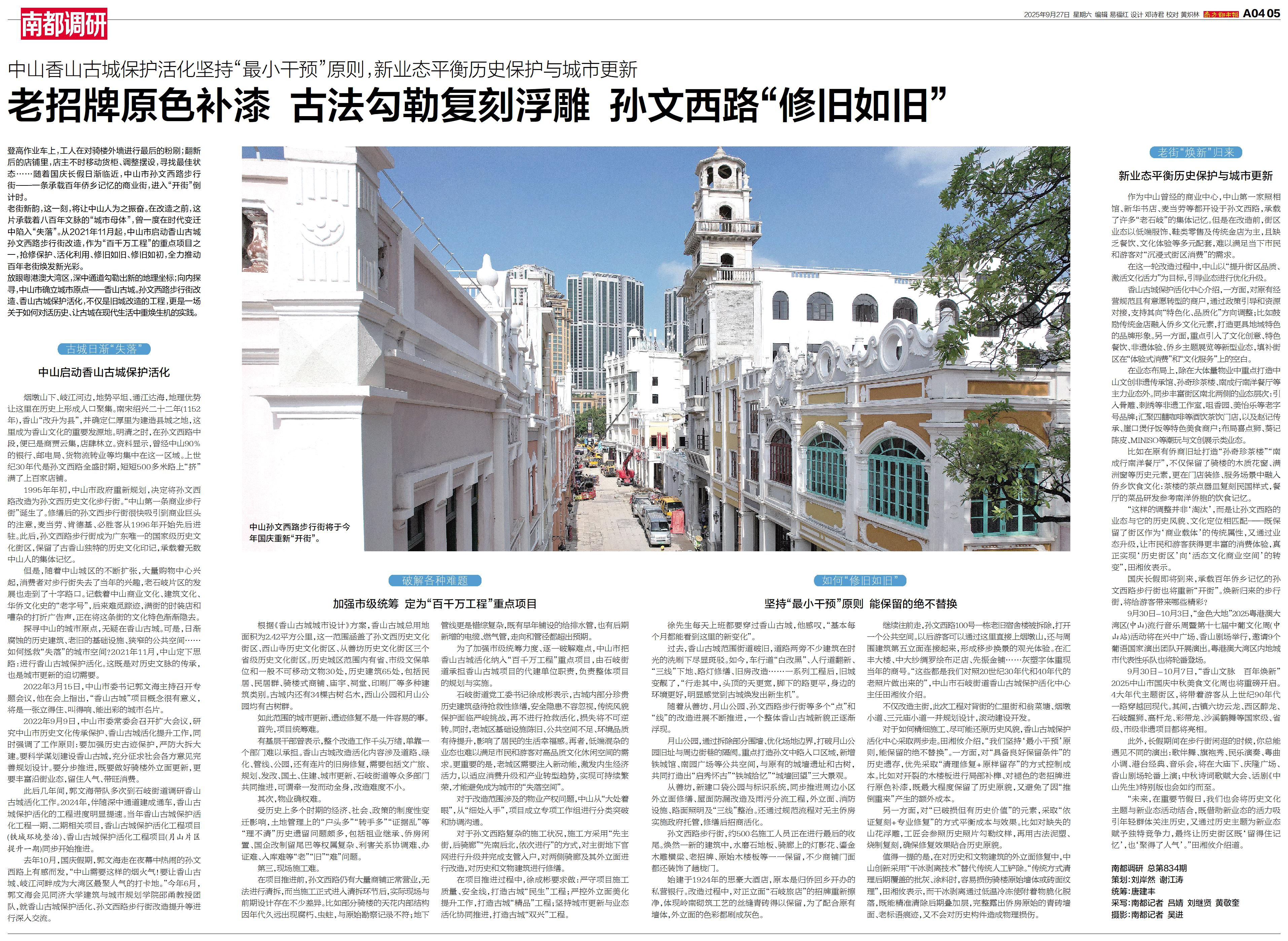 放眼粤港澳大湾区,深中通道勾勒出新的地理坐标;向内探寻,中山市确立城市原点——香山古城。孙文西路步行街改造、香山古城保护活化,不仅是旧城改造的工程,更是一场关于如何对话历史、让古城在现代生活中重焕生机的实践。