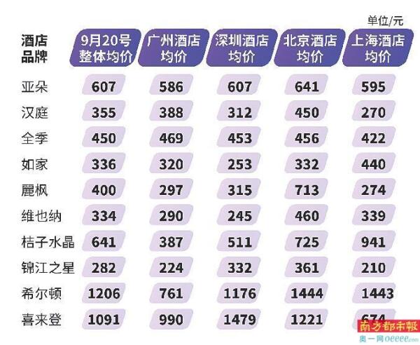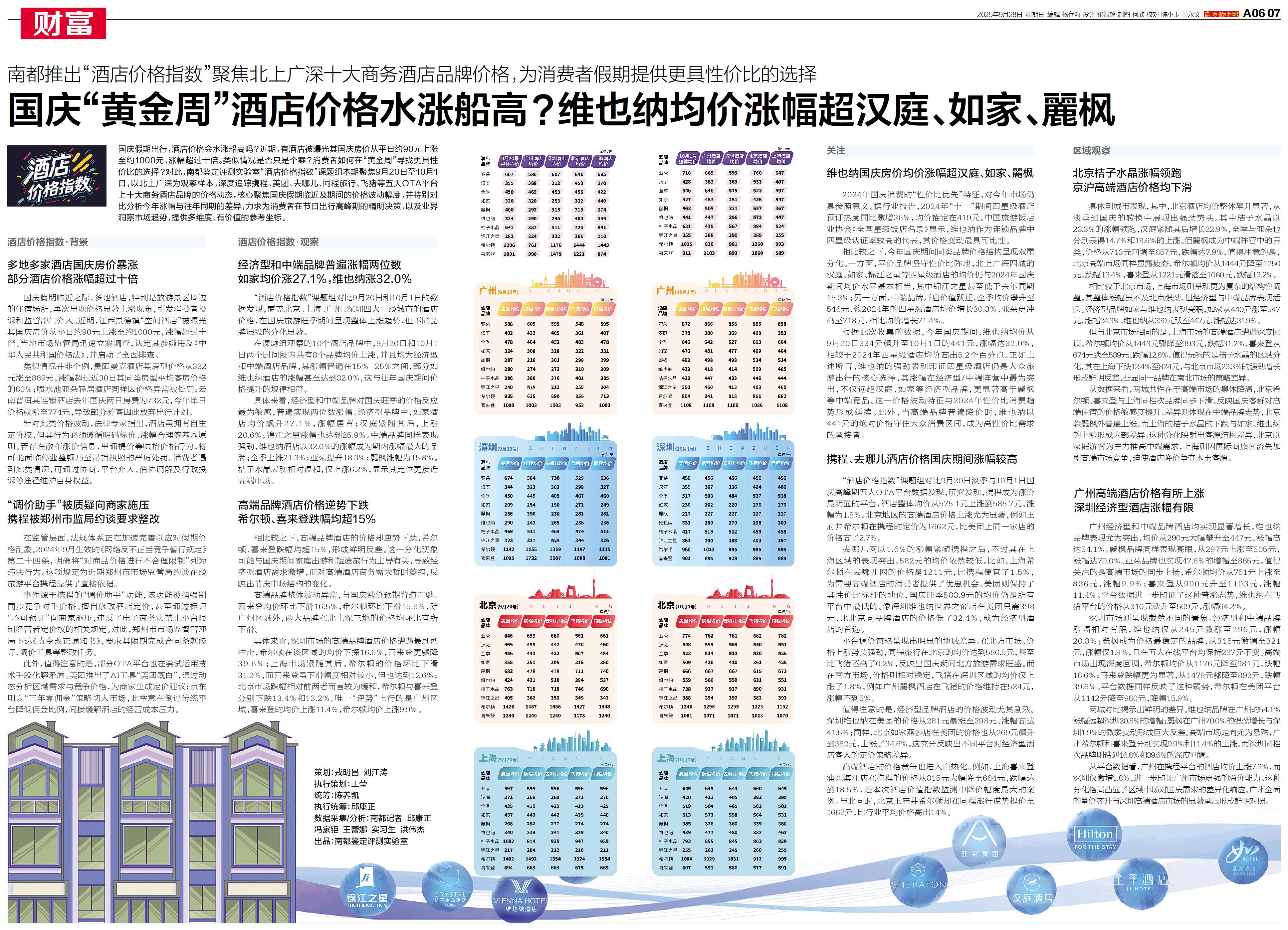 国庆假期出行,酒店价格会水涨船高吗?近期,有酒店被曝光其国庆房价从平日约90元上涨至约1000元,涨幅超过十倍。类似情况是否只是个案?消费者如何在“黄金周”寻找更具性价比的选择?对此,南都鉴定评测实验室“酒店价格指数”课题组本期聚焦9月20日至10月1日,以北上广深为观察样本,深度追踪携程、美团、去哪儿、同程旅行、飞猪等五大OTA平台上十大商务酒店品牌的价格动态。核心聚焦国庆假期临近及期间的价格波动幅度,并特别对比分析今年涨幅与往年同期的差异,力求为消费者在节日出行高峰期的精明决策,以及业界洞察市场趋势,提供多维度、有价值的参考坐标。