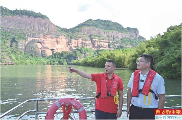 邮储银行韶关市分行相关负责人与祥源丹霞山旅游有限公司财务负责人坐游船到赤壁丹崖。