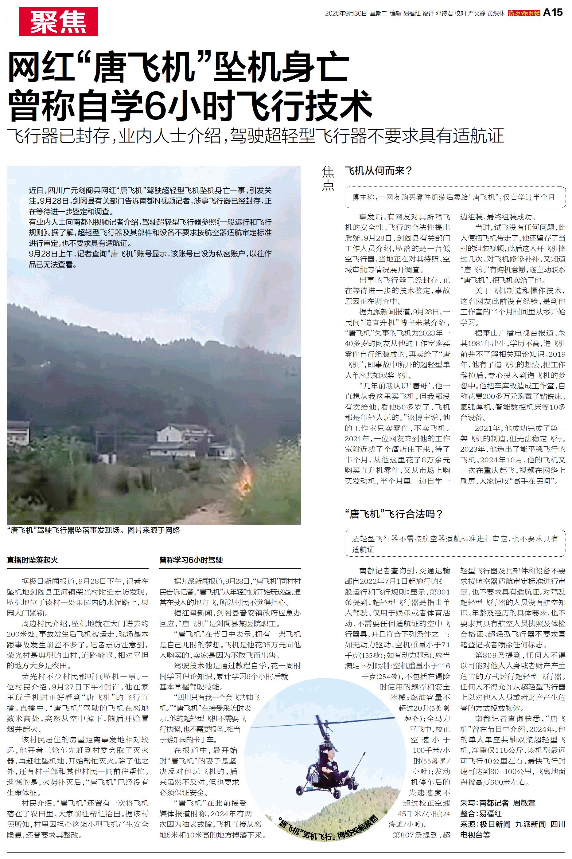 近日,四川广元剑阁县网红“唐飞机”驾驶超轻型飞机坠机身亡一事,引发关注。