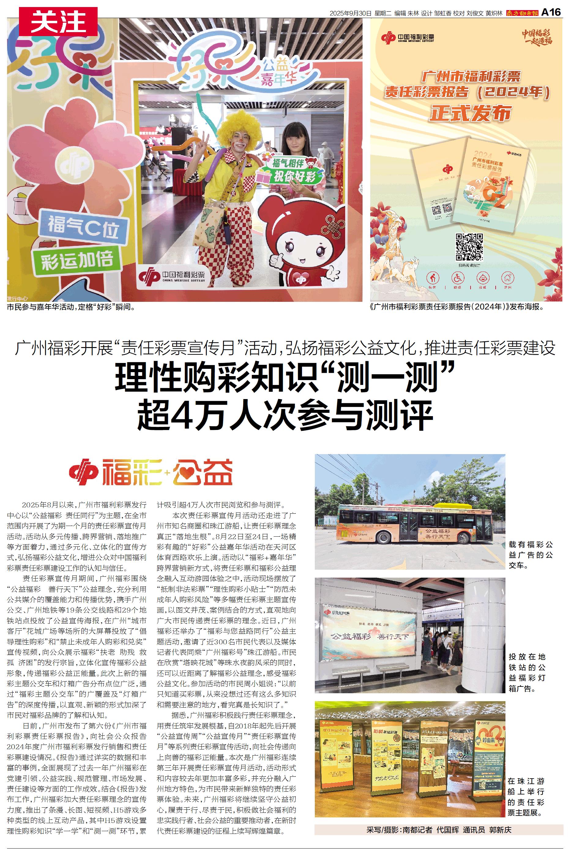 2025年8月以来,广州市福利彩票发行中心以“公益福彩 责任同行”为主题,在全市范围内开展了为期一个月的责任彩票宣传月活动。