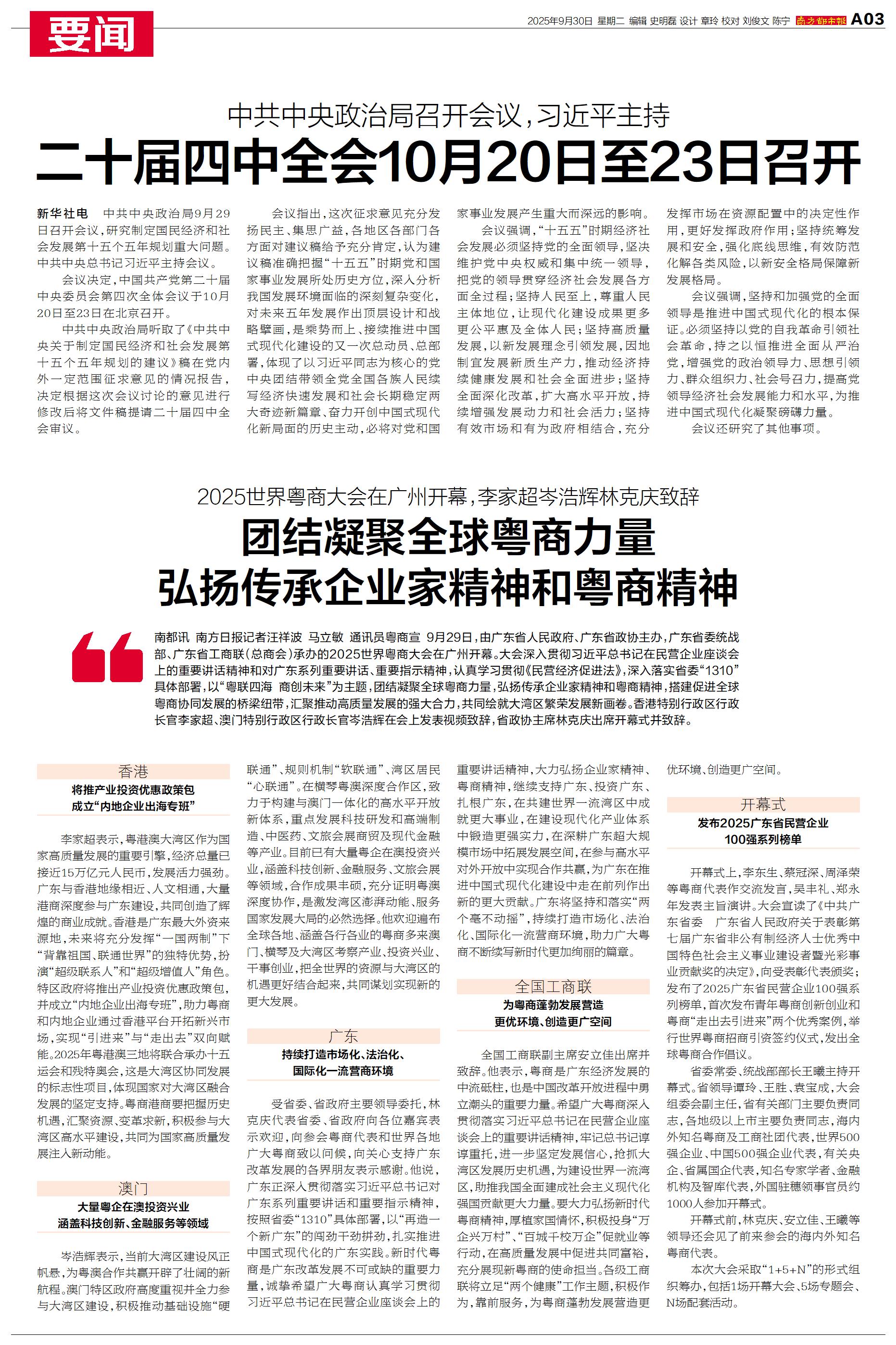 二十届四中全会10月20日至23日召开