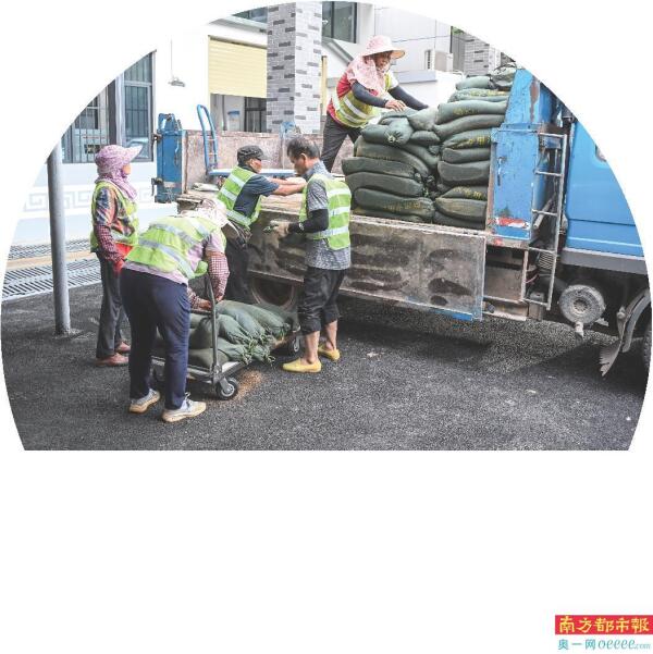 3日,南宁市水利部门工作人员搬运应急防汛沙包。新华社发