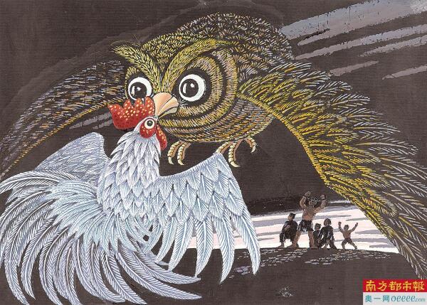 “廖冰兄的创作从不是孤军奋战。”陈嘉顺指着展柜介绍,除廖冰兄的作品外,展览还特别遴选了与他同期活跃的多位著名画家的代表作,以“群像”形式展现抗战时期美术界的集体担当。譬如赖少其的成名作《抗战门神》——这幅作品以传统“门神”形象为载体,融入抗战元素,既保留民俗韵味,又传递出“抵御外敌”的象征意义,成为当时极具传播力的抗战视觉符号;又如符罗飞在抗战期间创作的“鸡鸣系列”作品——“鸡鸣”常象征“破晓”与“希望”,系列作品以含蓄的意象,暗喻民众对胜利的期盼,风格独特且富有深意。这些同期名家的作品与廖冰兄的创作相互呼应,共同勾勒出抗战时期美术界“以笔为刀、以画明志”的壮阔图景。