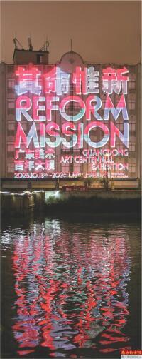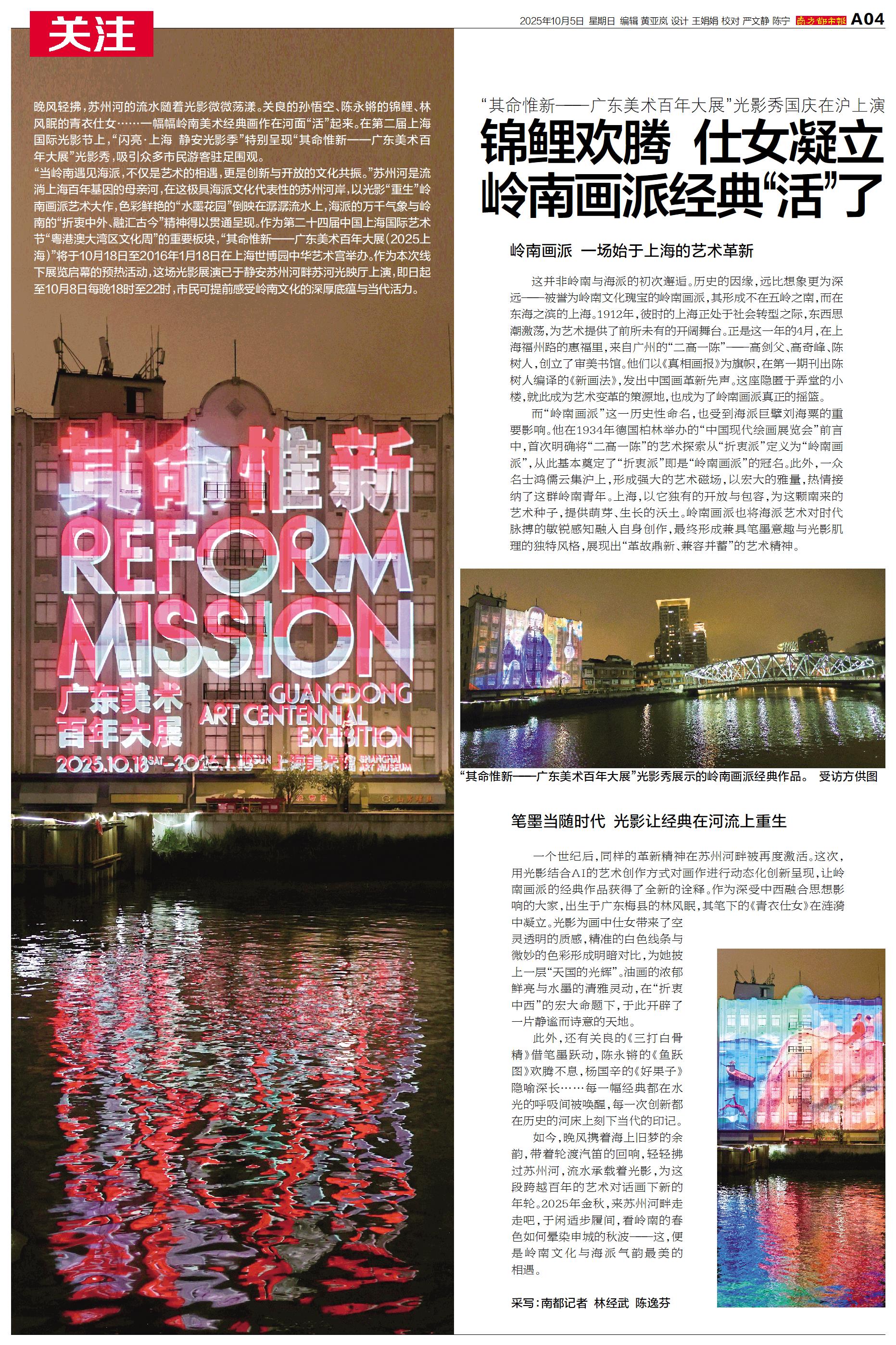 在第二届上海国际光影节上,“闪亮·上海 静安光影季”特别呈现“其命惟新——广东美术百年大展”光影秀,吸引众多市民游客驻足围观。