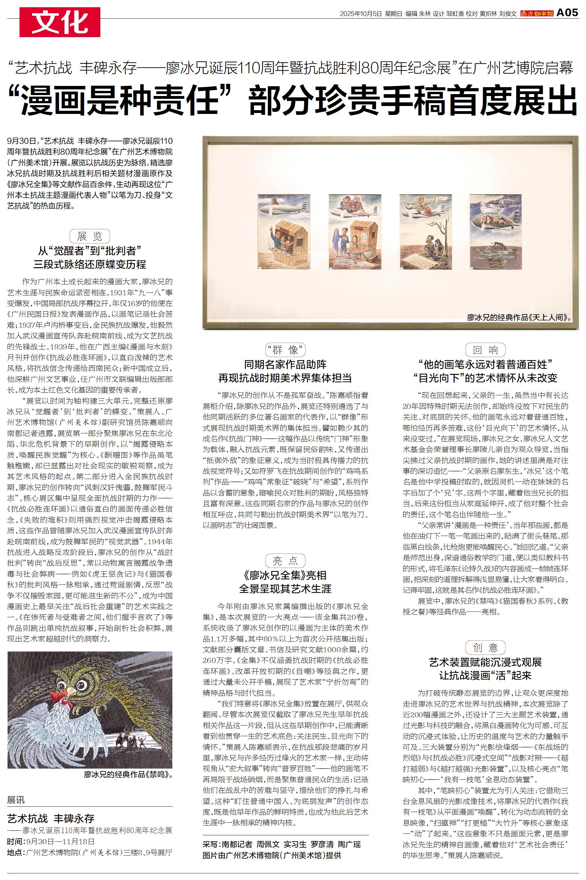 9月30日,“艺术抗战 丰碑永存——廖冰兄诞辰110周年暨抗战胜利80周年纪念展”在广州艺术博物院(广州美术馆)开展。