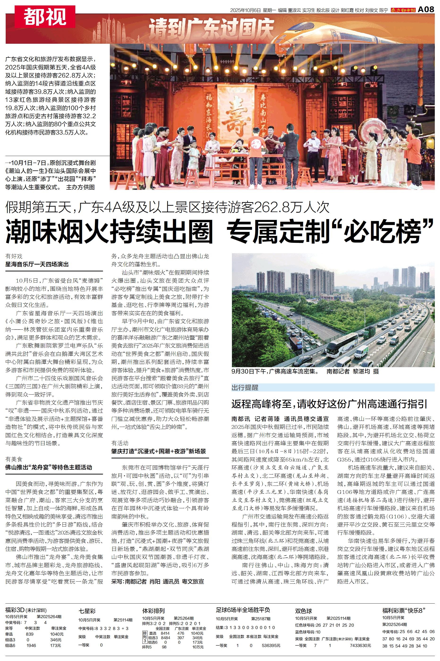 广东省文化和旅游厅发布数据显示,2025年国庆假期第五天,全省4A级及以上景区接待游客262.8万人次。