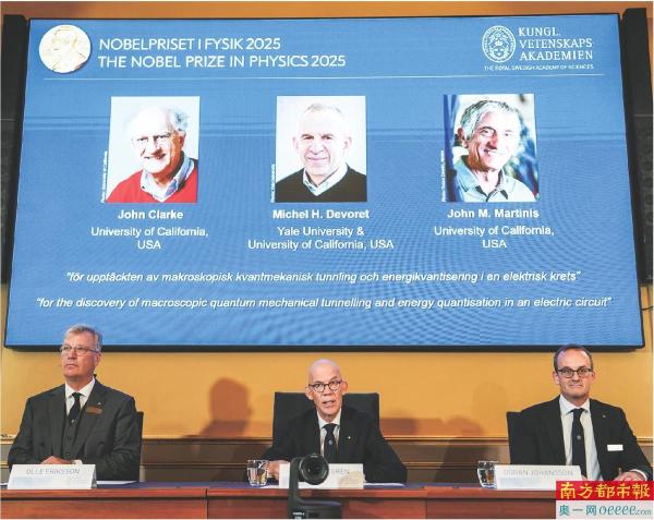 北京时间10月7日17时45分,瑞典皇家科学院宣布,2025年诺贝尔物理学奖授予美国加州大学约翰·克拉克,美国耶鲁大学米歇尔·H·德沃雷特,美国加州大学约翰·M·马蒂尼斯,以表彰他们发现了电路中宏观量子力学隧穿效应和能量量子化现象。