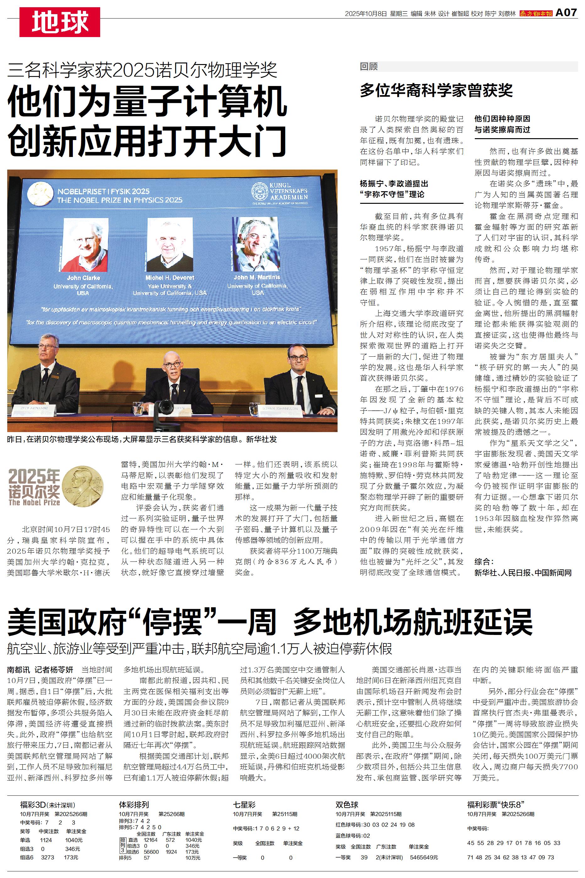 北京时间10月7日17时45分,瑞典皇家科学院宣布,2025年诺贝尔物理学奖授予美国加州大学约翰·克拉克,美国耶鲁大学米歇尔·H·德沃雷特,美国加州大学约翰·M·马蒂尼斯,以表彰他们发现了电路中宏观量