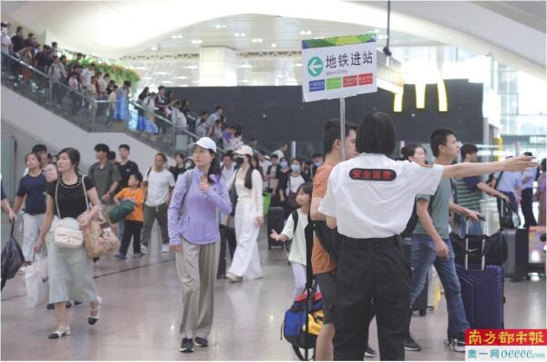 广州南站,工作人员举着牌子,引导旅客快速前往地铁站乘车。南都记者 任磊斌 通讯员 戴鸣 摄