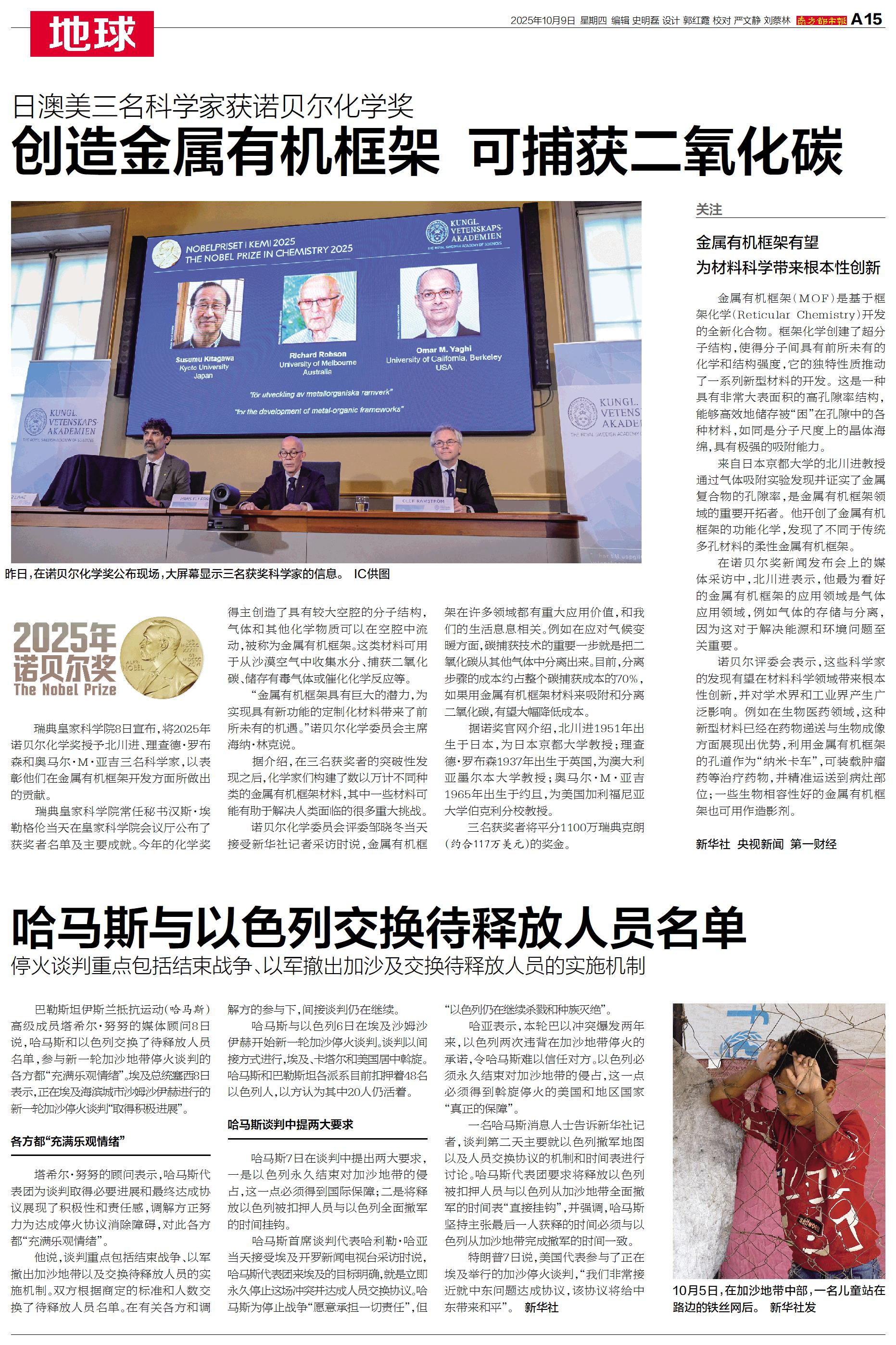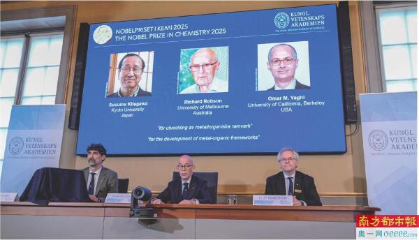 瑞典皇家科学院8日宣布,将2025年诺贝尔化学奖授予北川进、理查德·罗布森和奥马尔·M·亚吉三名科学家,以表彰他们在金属有机框架开发方面所做出的贡献。