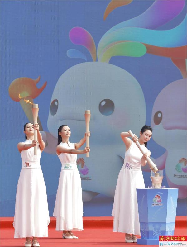10月9日,十五运会和残特奥会火种采集仪式在广州南沙举行,采火少女在“源火”台引燃手中的采火棒。