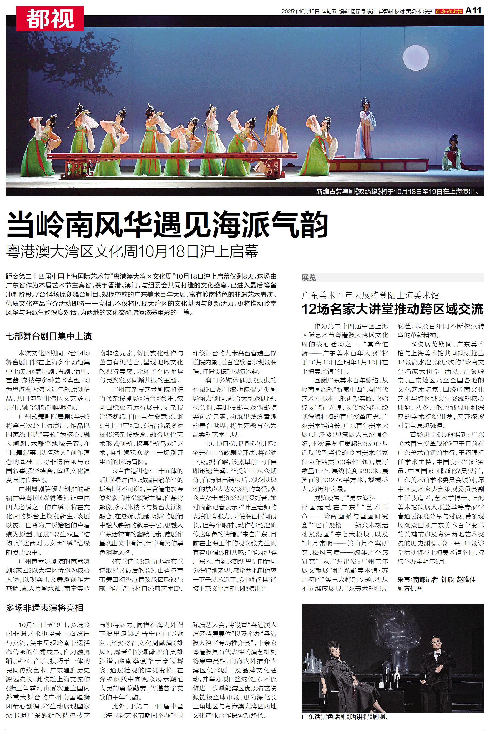 距离第二十四届中国上海国际艺术节“粤港澳大湾区文化周”10月18日沪上启幕仅剩8天,这场由广东省作为本届艺术节主宾省,携手香港、澳门,与组委会共同打造的文化盛宴,已进入最后筹备冲刺阶段。