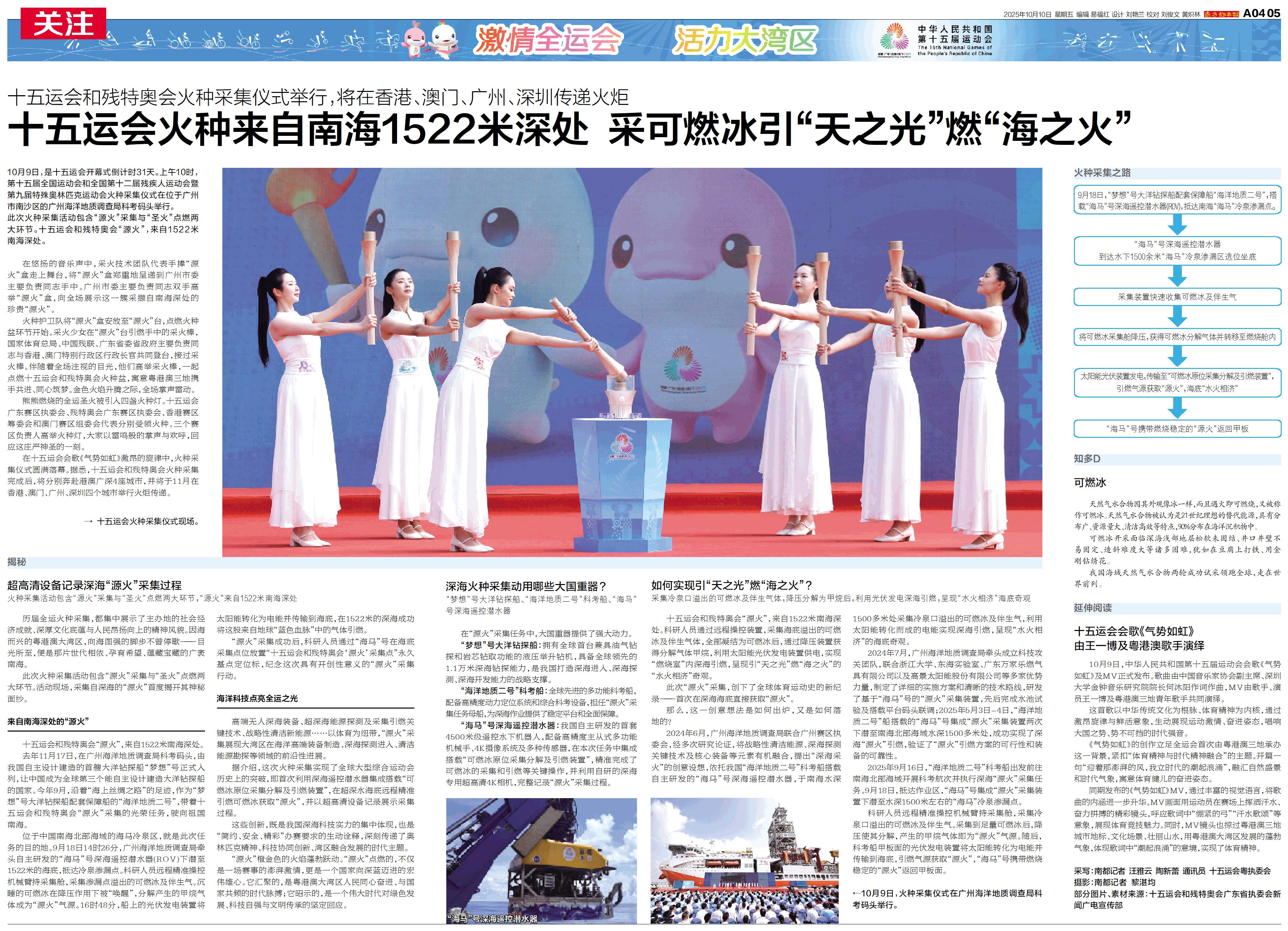 10月9日,是十五运会开幕式倒计时31天。上午10时,第十五届全国运动会和全国第十二届残疾人运动会暨第九届特殊奥林匹克运动会火种采集仪式在位于广州市南沙区的广州海洋地质调查局科考码头举行。