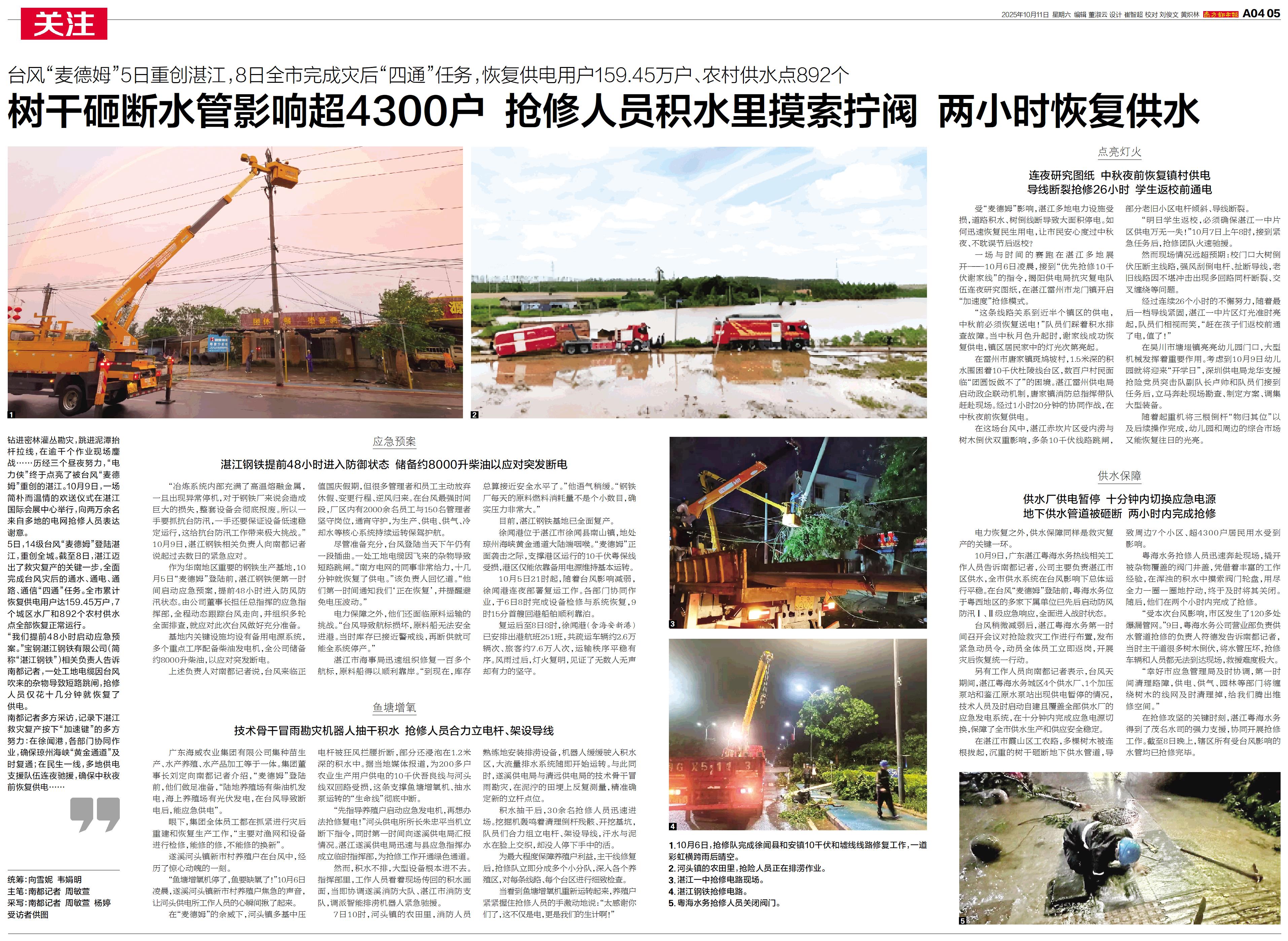 钻进密林灌丛勘灾,跳进泥潭抬杆拉线,在逾千个作业现场鏖战……历经三个昼夜努力,“电力侠”终于点亮了被台风“麦德姆”重创的湛江。