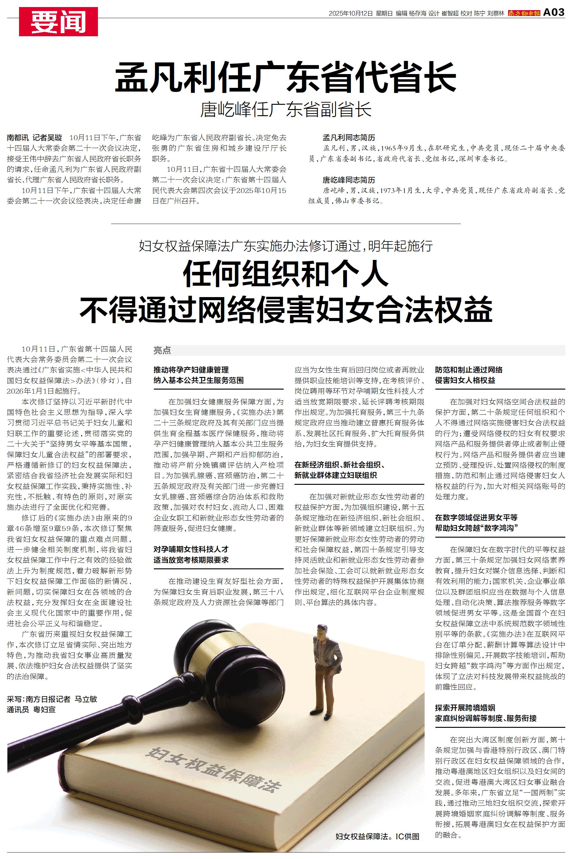 10月11日,广东省第十四届人民代表大会常务委员会第二十一次会议表决通过《广东省实施<中华人民共和国妇女权益保障法>办法》(修订),自2026年1月1日起施行。