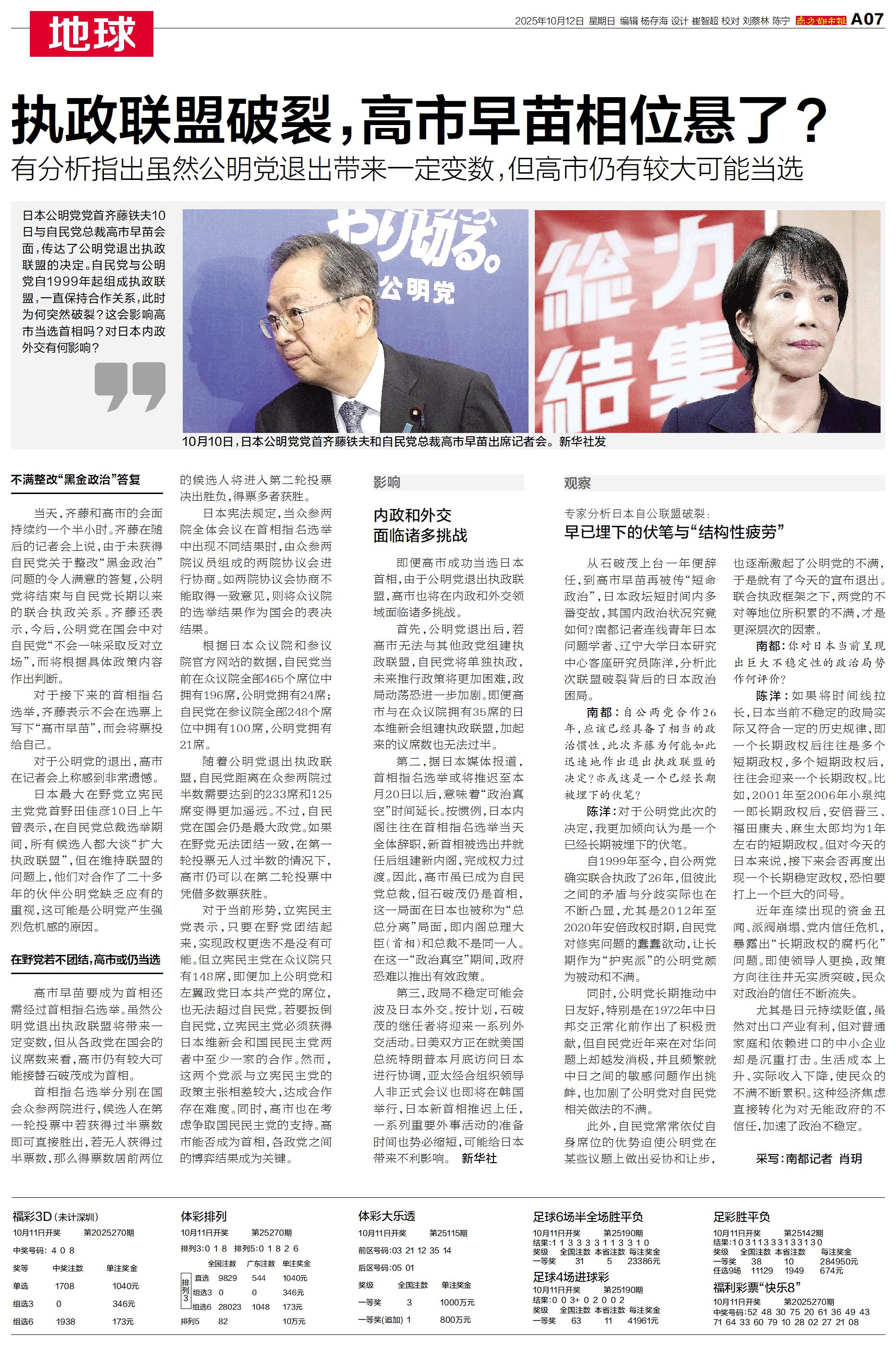 日本公明党党首齐藤铁夫10日与自民党总裁高市早苗会面,传达了公明党退出执政联盟的决定。