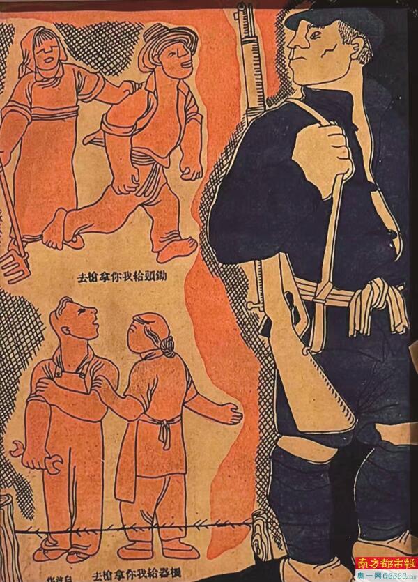 梁白波《锄头给我,你拿枪去》,漫画,1938年。