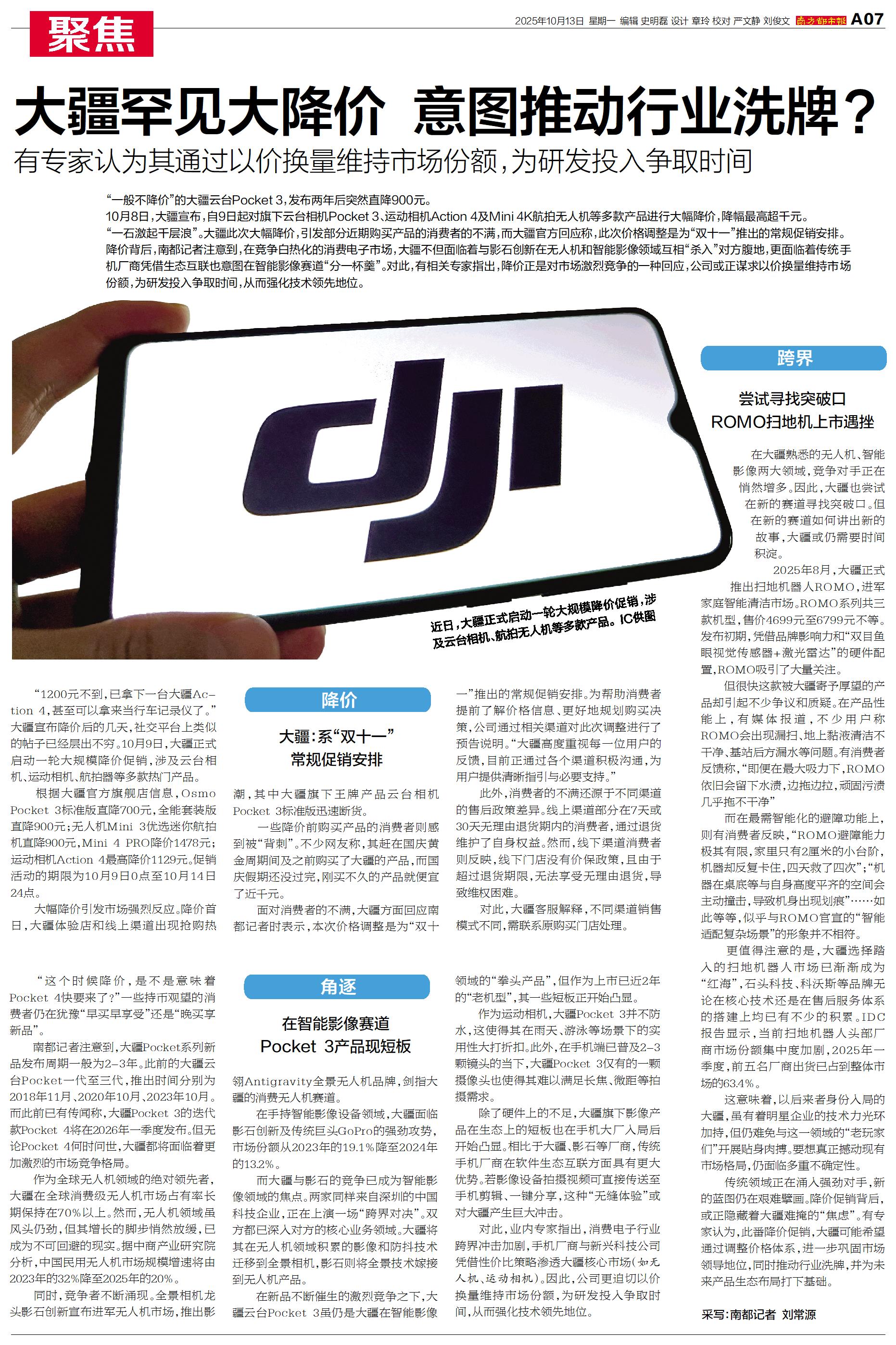 10月8日,大疆宣布,自9日起对旗下云台相机Pocket 3、运动相机Action 4及Mini 4K航拍无人机等多款产品进行大幅降价,降幅最高超千元。